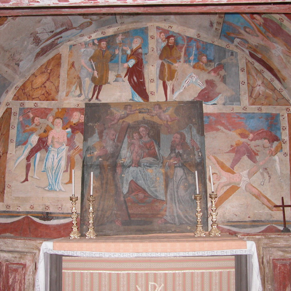 La piccola cappella campestre si trova a 1700 metri di quota, a circa dieci minuti a piedi dalla carrozzabile, presso Millaures, una frazione di Bardonecchia, ed è situata ai margini di un alpeggio, circondata da pascoli e posta su di un ampio declivio dal quale si può ammirare un bellissimo panorama dell’intera conca di Bardonecchia. La sua costruzione risale probabilmente alla fine del XV secolo per volere di una famiglia locale. Nel 1817 la cappella viene rimaneggiata, come attesta la data apposta all’ingresso: viene tamponata la porta in facciata e ne viene aperta un’altra esposta a sud. Nella stessa occasione viene rimossa la cancellata lignea che separava l’area del presbiterio da quella per i fedeli e viene allestita la cantoria in controfacciata. La cappella presenta una semplice struttura a navata unica con volta a botte e facciata sormontata da un campanile a vela, è decorata, sia internamente che esternamente, da cicli affrescati assegnati a tre distinti artisti operanti intorno agli anni Trenta del Cinquecento. La facciata presenta una raffigurazione suddivisa in tre livelli: il timpano è dominato dalle figure, purtroppo solo parzialmente conservate, dei Santi Andrea e Pietro, al di sotto dei quali si colloca la rappresentazione della Cavalcata dei Vizi, anch’essa frammentaria. Sono invece del tutto scomparse le scene del registro inferiore, dove erano collocate le pene infernali. L’interno presenta sulle volte a botte della navata le scene della Vita di San Giacomo, cui si associano, nel medesimo ambiente, le raffigurazioni della Messa di San Gregorio, sulla parete sinistra, e un frammentario San Giorgio che uccide il drago, sulla parete destra. L’area del presbiterio ospita la raffigurazione delle Storie di Sant’Andrea, affiancate da Santa Lucia e dalla figura di Sant’Antonio abate. La realizzazione dei cicli affrescati si deve alla mano di tre artisti distinti: il primo, di gusto più arcaico e ancora legato agli stilemi della bottega dei Serra, realizzò le storie di San Giacomo nella navata; un secondo pittore, di grande raffinatezza e identificabile con il Maestro di San Sebastiano a Plampinet, eseguì le quattro scene della vita di Sant’Andrea presenti nella parete centrale della volta del presbiterio, oltre alle figure di Santa Lucia, Sant’Antonio, San Giorgio e il drago; un terzo pittore, dal tratto più corsivo e influenzato dai temi del manierismo, eseguì infine le restanti scene della vita del Santo presenti nel presbiterio, la Messa di San Gregorio nella navata e le decorazioni della facciata.