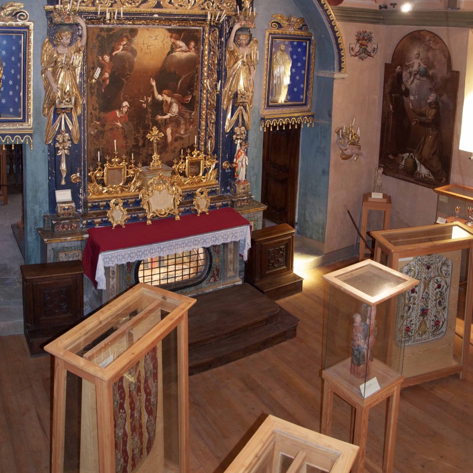 Once inside the 18th-century door, visitors see the nave furnished with showcases containing liturgical vestments that evoke the presence of the clergy, guiding the eye to the altar with its remarkable painted, gilded stuccoes and Annunciation altarpiece dating from the mid-17th century, as well as a 15th-century fresco of the Pietà, reminiscent of the style of the Biazaci brothers of Busca. The layout takes into account the original use of the building and seeks to preserve the signs of the centuries when these spaces were dedicated to worship and meeting. Highlights of the collections include a rare 15th-century miniature and three altarpieces by Vittorio Amedeo Rapous, datable to the 1760s, painted for Acceglio’s Cappuccini church, suppressed in 1802, from which the painting by Jean Claret commissioned by the Taffini family, feudal lords of Savigliano, also hails. The exhibition rooms added with the extension commenced in 2000 include one dedicated to local worship and another to house the works of Acceglio painter Matteo Olivero (1879–1932).