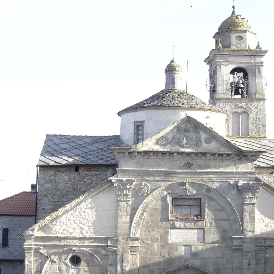Una prospettiva privilegiata per osservare la chiesa è senz’altro quella che offre il castello che si affaccia sulla piazza, di fronte alla parrocchiale: di grande bellezza è la facciata con il timpano che racchiude il Dio benedicente, due rilievi con Gabriele e Maria affiancano i capitelli e la lapide del committente sovrasta il portale.