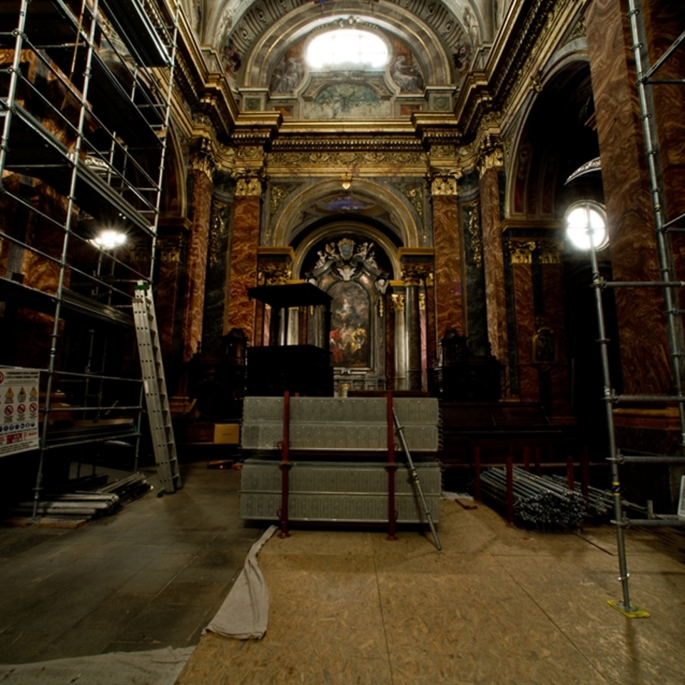 Situated on the site of the old church of San Francesco, the cathedral was designed by the architect Francesco Gallo and built between 1743 and 1753. It was completed ten years later with the extension of the chapel of the Santissimo and the Bishops’ Crypt, and was consecrated by Mons. Casati on 4 September 1763. The portal of the monumental sandstone façade is surmounted by a statue of Saint Donatus between the figures of Faith and Charity by Giuseppe Quadrone. The cathedral has a Greek cross plan with a nave and two aisles, lengthened in the presbytery and the choir. During the 19th century its sumptuous decoration, enriched with stucco and paintings, was entrusted to the painters Morgari, Hartman, Gounin and Vinaj. The side altars have fine canvases: Saint Andrew by Felice Biella; The Virgin of the Immaculate Conception with Saints Charles and Felix by Mattia Bortoloni; Saint Mary of Mercy with Saints by Domenico Piola; The Passing Away of Saint Joseph by Sebastiano Taricco; The Last Supper by Andrea Vinaj; The Eucharistic Miracle of Turin by Hartman; Saint Lawrence by Francesco Mayer. At the end of the right aisle is the Suffrage Chapel, clad in polychrome marble with a white alabaster crucifix carved by Giuseppe Giudici. The vault painted by Giovenale Bongiovanni is a gem of Piedmontese Rococo art. The Renaissance-style wooden choir in the apse is from the charterhouse of Casotto. On the left of the presbytery is the vestibule, with walls inset with marbles from the old cathedral (transformed into a citadel by Emmanuel Philibert), a Renaissance altar with statues of the Virgin and Child between John the Baptist and John the Evangelist, made by Giovanni L. Sormani in 1507; and fragments of a 15th-century fresco depicting the Adoration of Christ, Saints Francis and Clare and an exceptionally delicate Virgin and Child. The huge chapter room is adorned with fine 17th and 18th-century canvases, a precious silver monstrance and the richly illuminated 15th-century missal with Late Gothic miniatures that belonged to Saint Pius V (Bishop of Mondovì, 1560–66). The 15th-century frescoes from the earlier convent complex can be seen in the vaults of the cloister next to the building.