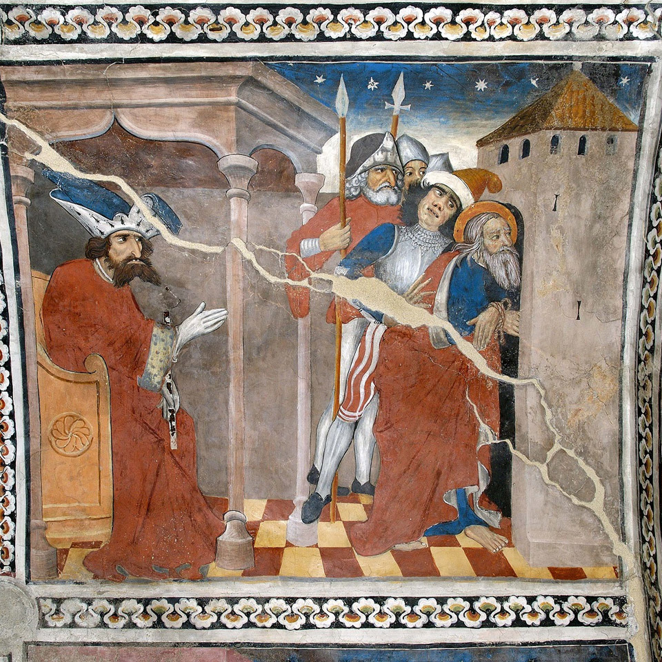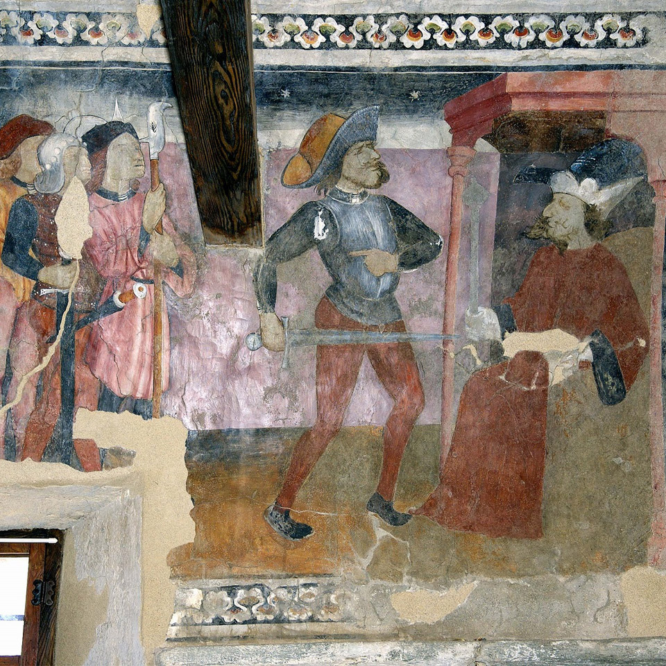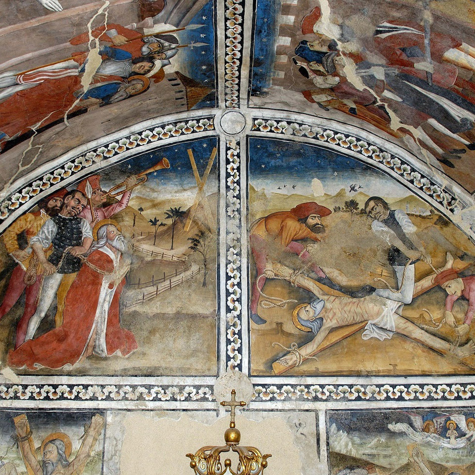 Presso la borgata Ramats fu più volte messo in scena il Mystère di Sant’Andrea, il cui martirio è raffigurato nel ciclo affrescato interno alla cappella. A queste rappresentazioni della vita o del Martirio di Santi e Sante o della Passione di Cristo, messe in scena nelle Chiese e nei Sagrati, prendevano parte gli abitanti in qualità di attori. Si trattava di una pratica diffusa nei paesi di lingua occitana fin dal basso Medioevo, con uno scopo catechetico e di difesa della religione cattolica. Gli affreschi con la Storia di Sant’Andrea sono proprio le scene di un antico Mystère e rappresentano gli episodi della passione e della morte del santo, organizzati con uno schema formale e compositivo che facilita la lettura dai fedeli. Infatti, la narrazione è accolta in un ripetersi di elementi paesaggistici e architettonici, come una sorta di palcoscenico. Il percorso inizia dalla volta absidale, continua sulla parete sinistra della volta e sulle pareti dell’abside e si conclude con la sepoltura del Santo. I personaggi, soprattutto quelli negativi, presentano tratti fisionomici marcati, spesso grotteschi: questo serviva a rendere più patetica e coinvolgente la vita del Santo.