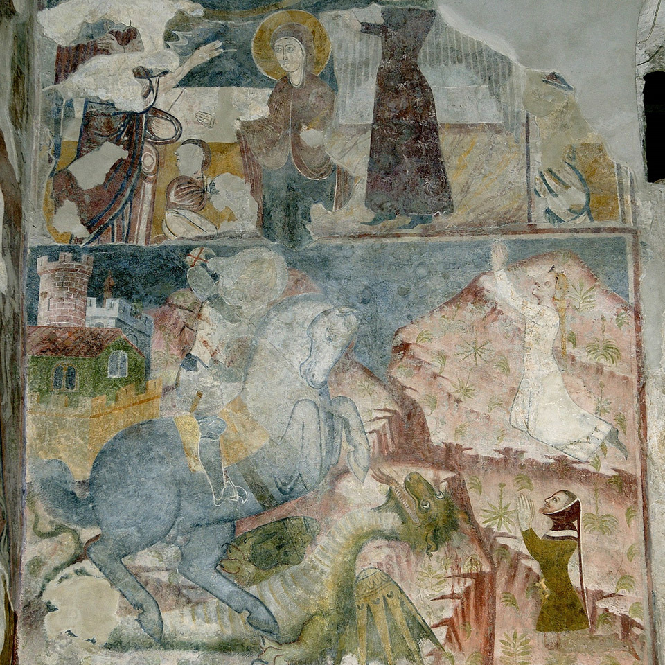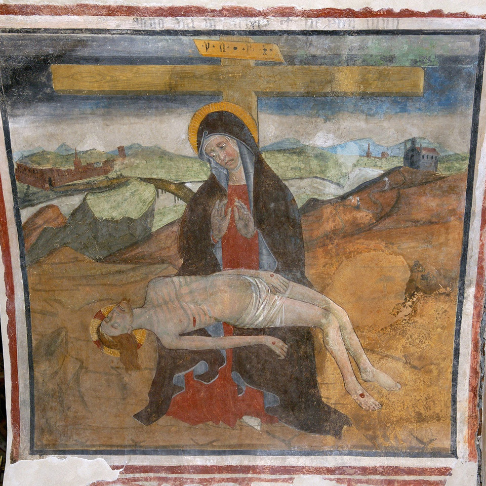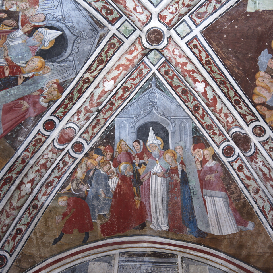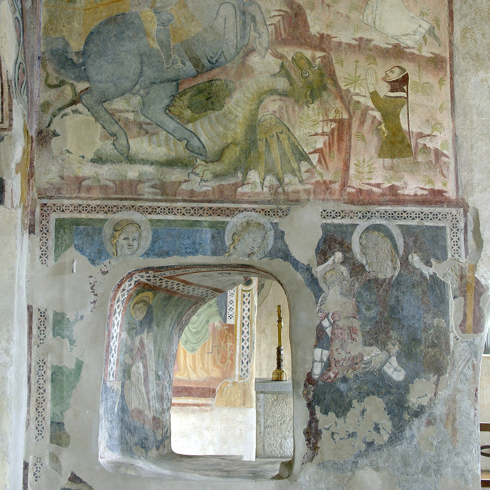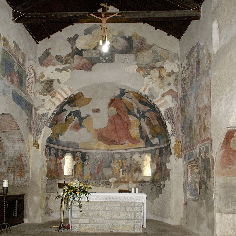 La decorazione interna ad affresco è l'esito di stratificazioni pittoriche che vanno dall'XI al XV secolo. Sulle pareti degli edifici sacri venivano dipinte storie e immagini della Bibbia e della Vita di Santi e Sante, organizzate in modo da illustrare ai fedeli episodi della loro vita e della storia di Gesù. Questa tipologia di rappresentazione iconografica viene definita Biblia pauperum, ossia Bibbia dei poveri: serviva e da supporto visivo alla celebrazione liturgica, oltre che alla devozione delle persone di umile estrazione che non sapevano o non potevano leggere i testi sacri.
