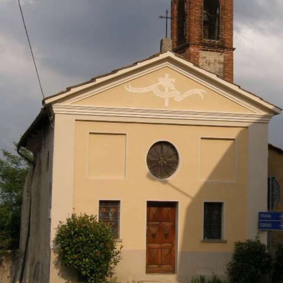 Addossata al muro di cinta del camposanto, presenta linee architettoniche semplici, con due piccole finestre ai lati della porta d’ingresso, sormontata da un rosone. L’edificio a pianta rettangolare ad aula unica è suddiviso in tre campate voltate a vela; sul lato destro della seconda campata vi è la sacrestia su cui si innesta il basso campanile in mattoni rossi.