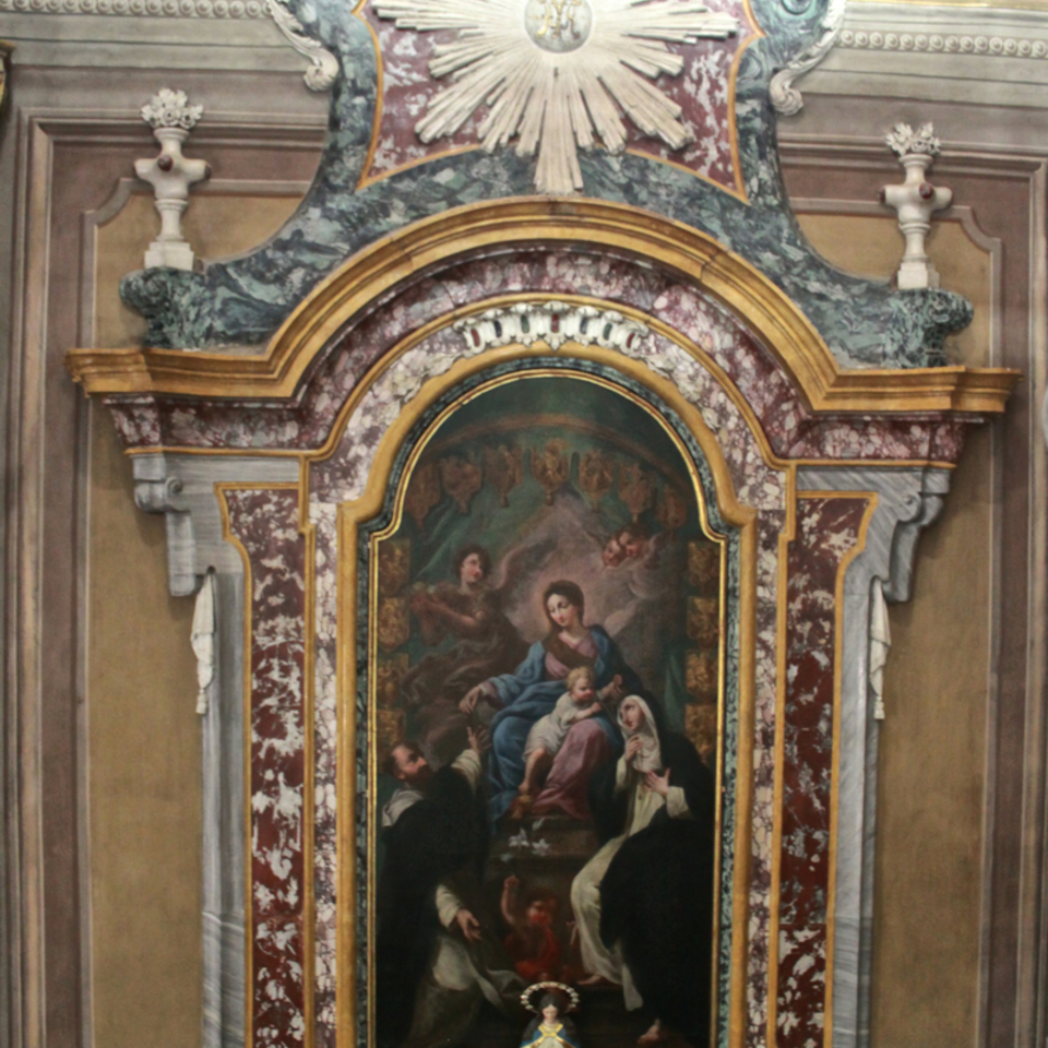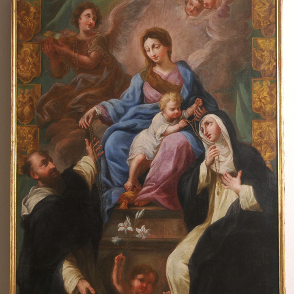 Quello della Madonna del Rosario è un culto molto antico, l’iconografia più conosciuta è quella in cui la corona del Rosario viene donata a Santa Caterina da Siena e a San Domenico di Guzman, inginocchiati ai lati del trono; questo è esattamente il caso del dipinto in oggetto, che nasce per essere posizionato ed incorniciato nell’altare in stucco policromo della cappella dedicata alla Vergine del Rosario nella chiesa di San Grato Vescovo a Piscina. Il dipinto è opera del pittore Ignazio Nepote ed è attribuibile all’ultima fase artistica del pittore, in una data compresa tra il 1766 (data di costruzione della chiesa di San Grato) e il 1780 anno della sua morte. Prima del recente intervento di restauro erano visibili un taglio al centro della tela ed un’evidente toppa e si osservava una generale opacizzazione della vernice con un consistente deposito di polvere superficiale. Il restauro ha riportato alla luce le cromie originarie, svelando la morbidezza dei panneggi e valorizzando la qualità pittorica dell’opera del Nepote, che erano state nascoste per lungo tempo a causa di alcune ridipinture. L’intervento inoltre ha permesso di osservare la scritta presente sul retro del telaio, testimonianza della fattura originaria.