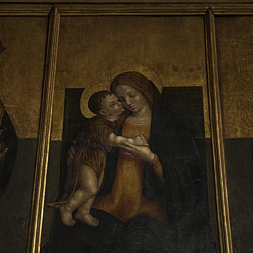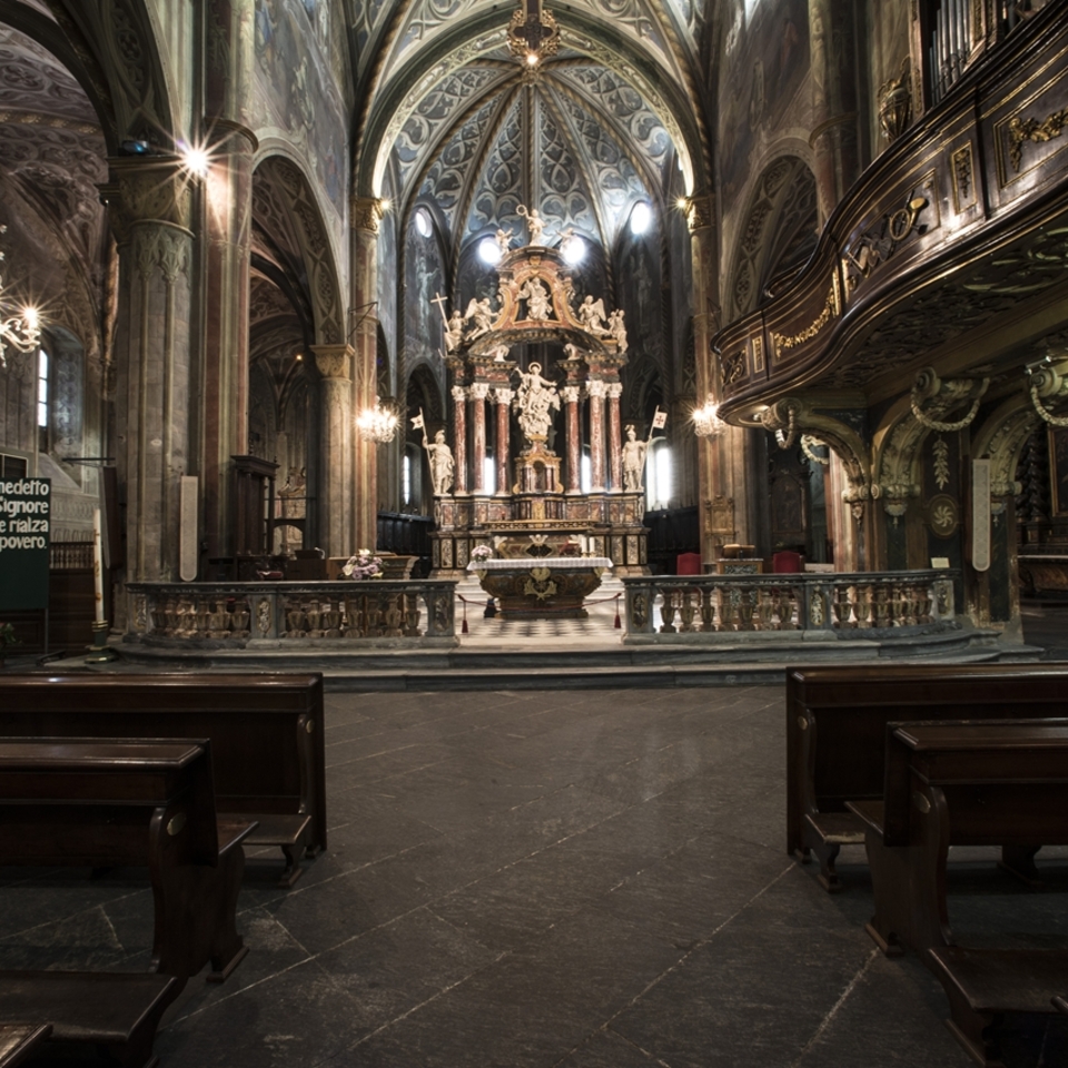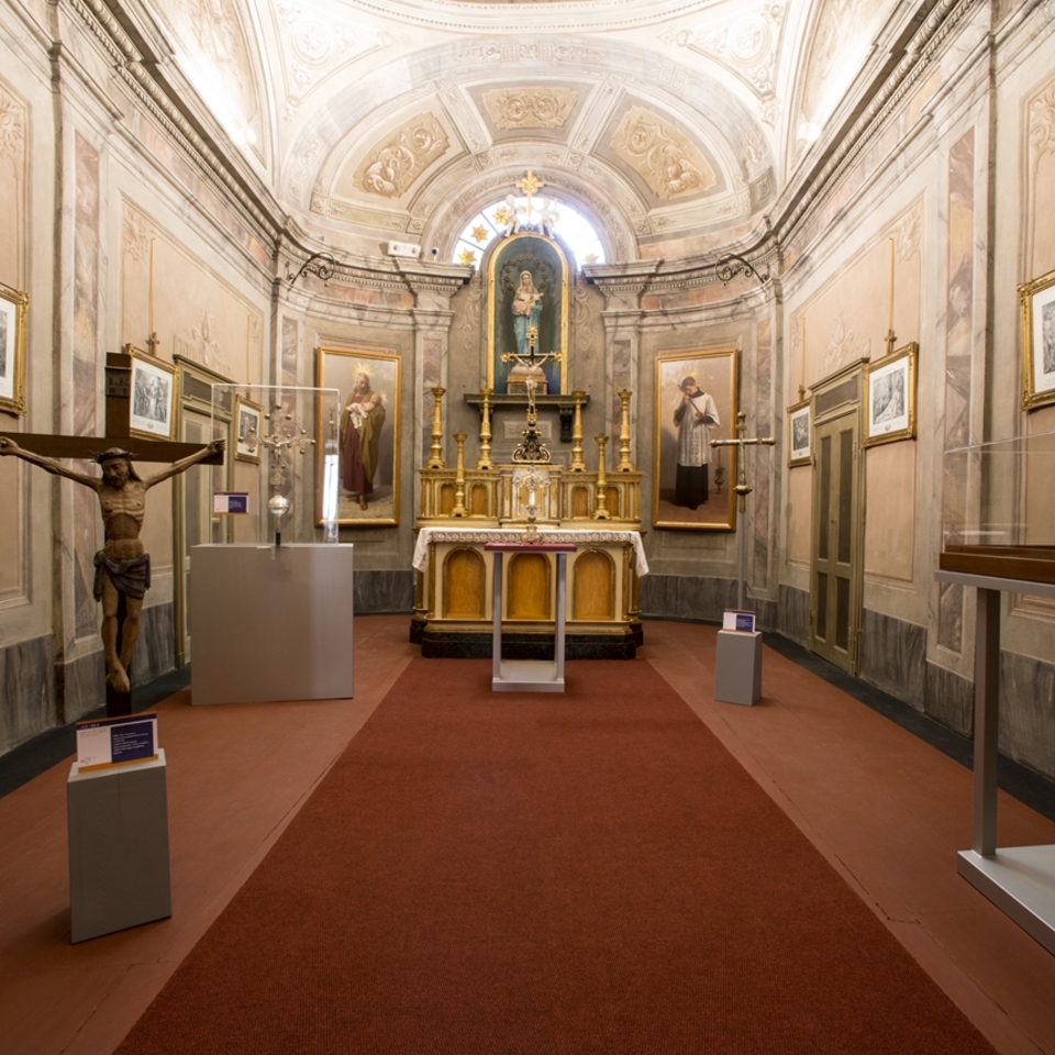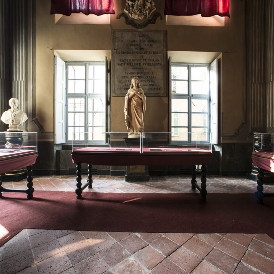 The majestic wooden crucifix attributed to the carver Baldino da Surso – the sole surviving piece of the furnishings of the pieve of Santa Maria – is suspended from the triumphal arch of the chancel, which is raised and separated from the nave by a balustrade. The chapel of the Holy Sacrament, along the left aisle, was commenced in 1700 by Mons. Morozzo, commemorated in the funerary monument by the sculptor Carlo Tantardini, and was restored in 1862 to the design of Edoardo Arborio Mella. Today it houses the polyptych of the Marquises of Saluzzo and opens onto the smaller chapel of Relics. According to a document dated 1729, the head and many parts of the body of Saint Chiaffredo, initially the patron of the Marquisate and subsequently also of the Diocese, are preserved in the Holy Sacrament altar. The head of Saint Chiaffredo, transferred to the cathedral from Revello in 1642, is now housed in the precious reliquary attributed to the goldsmith Antonio Benedetto Caire, and displayed for veneration on occasion of the saint’s feast day, on the first Sunday of September and also in the event of calamities. Saints Chiaffredo and Constantius have been venerated in the Saluzzo area since medieval times. According to tradition, the two martyrs were soldiers of the Theban Legion who escaped the massacre at Agaunum in the 3rd century AD, fleeing to the Saluzzo Valleys to preach the Gospel. Killers sent by the Emperor Diocletian found and slaughtered them: Chiaffredo was martyred in Crissolo, in the Upper Po Valley, and Constantius at the entrance to the Maira Valley, marked by the church of San Costanzo al Monte.