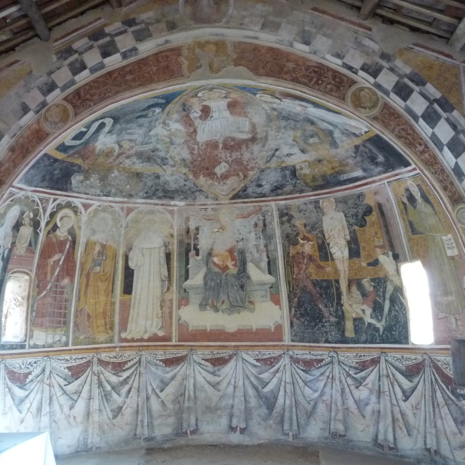 Nel catino absidale, la mandorla con il Cristo Giudice benedicente tra gli angeli è circondata dai simboli dei quattro evangelisti. Sulla parete absidale al centro, seduta in trono, la Vergine con Bambino. Ai lati segue una serie di Santi: Caterina da Siena che adora il Cristo nel sepolcro (Cristo di Pietà), Lorenzo, Pietro, Bernardo d'Aosta o forse Giacomo di Compostella protettori dei pellegrini, Bernardino da Siena e il martirio di S. Sebastiano.