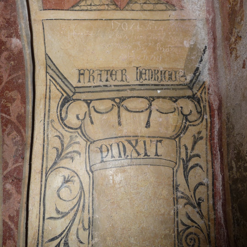 Nell’interno un importante ciclo di affreschi, restaurati nel 1967 dal professor Fiume di Milano, portano, in modo ben evidente, scritte sui capitelli dipinti dell'arco trionfale: la data del 1 Settembre 1451 e la firma dell'autore «Frater Enricus Pinxit».