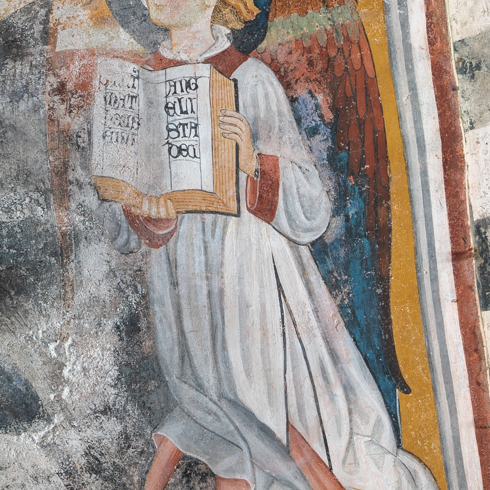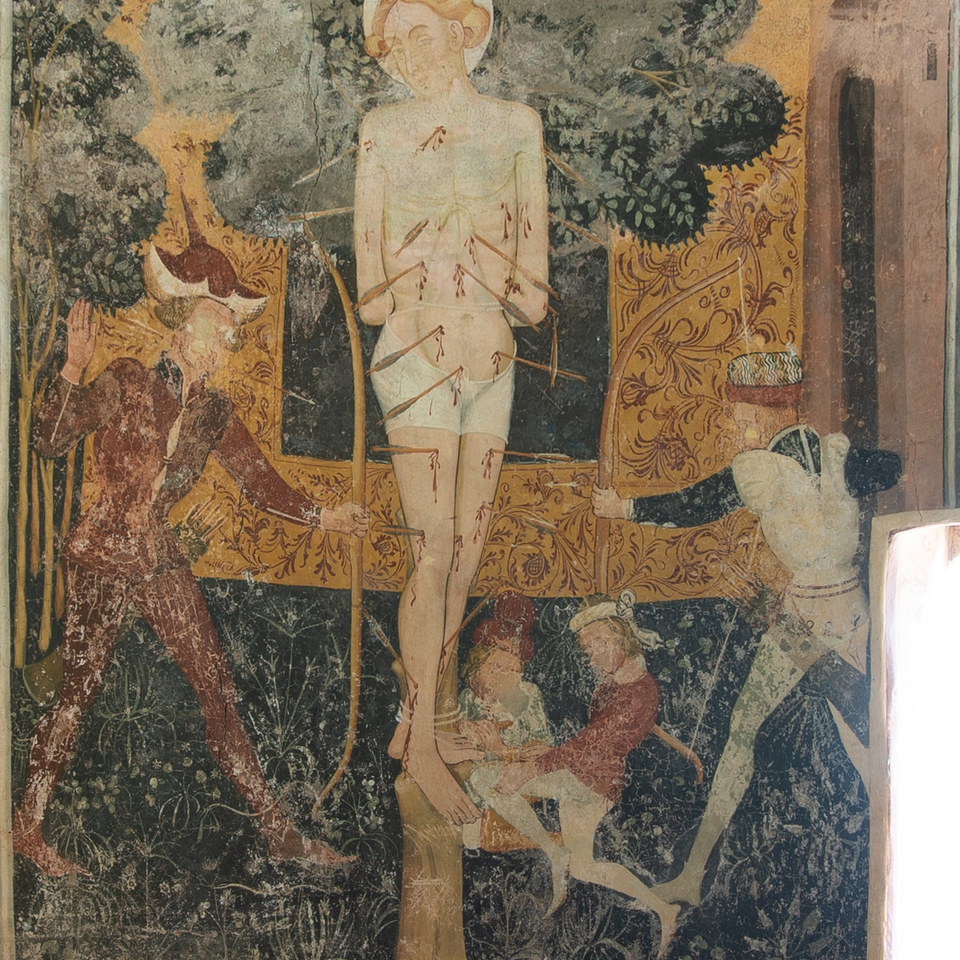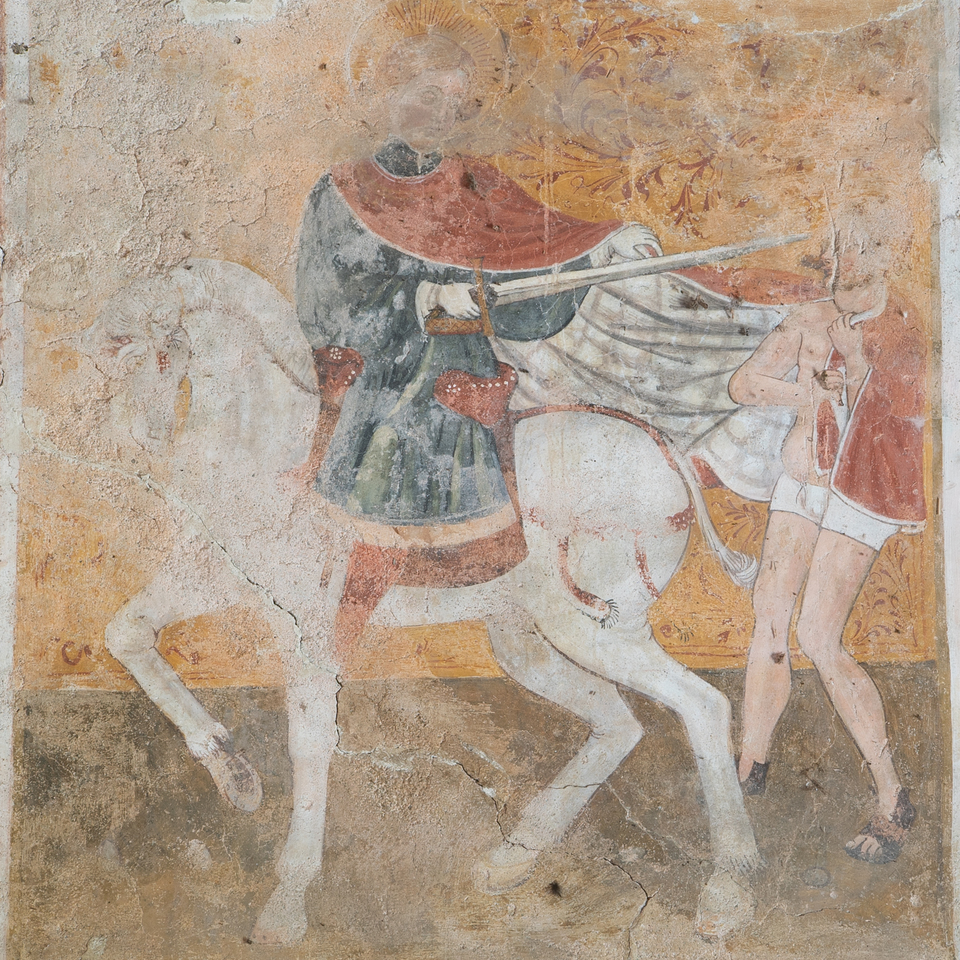 Nella parete di destra: San Martino e il mendicante e sotto San Michele che pesa le anime.