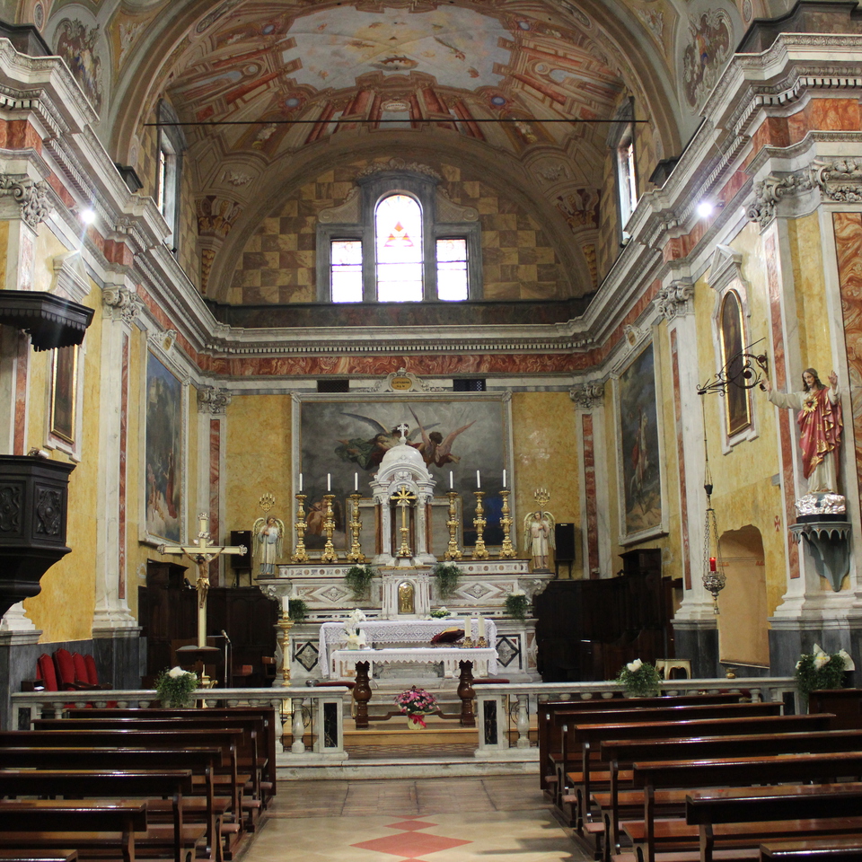 Le plurisecolari vicende storiche della parrocchiale di Santa Caterina sono narrate dagli arredi per la liturgia e dagli apparati decorativi in essa stratificatisi. Tra le devozioni più antiche - stante gli affreschi superstiti del nucleo quattrocentesco intorno a cui si sviluppa l'edificio attuale - spiccano quella per Santa Caterina d'Alessandria e per San Cristoforo (le raffigurazioni della Santa cui è dedicata la chiesa, già Collegiata, tornano in facciata, nell'Apoteosi dipinta nella volta, nei riquadri del presbiterio ad imitazione di grandi teleri). La devozione a Sant'Antonio Abate si manifesta precocemente, e si rivitalizza nel Settecento con quella per San Giuseppe, Sant'Antonio da Padova e San Bernardo da Chiaravalle. Il celebre Netu Borgna interpreta personalmente, nel 1882, il culto per San Chiaffredo (che guarda al Santuario di Crissolo) e San Costanzo, patroni della Diocesi di Saluzzo, con gli affreschi del presbiterio. Costante è la devozione mariana, come attestano le statue processionali della Madonna del Rosario, dell'Addolorata e dell'Assunta. Tra i dipinti più moderni che arredano l'aula della chiesa, sorprende il San Ponziano, mentre ci vengono trasmesse le reliquie di Sant'Orsola e di San Probo, custodite nei rispettivi reliquiari.