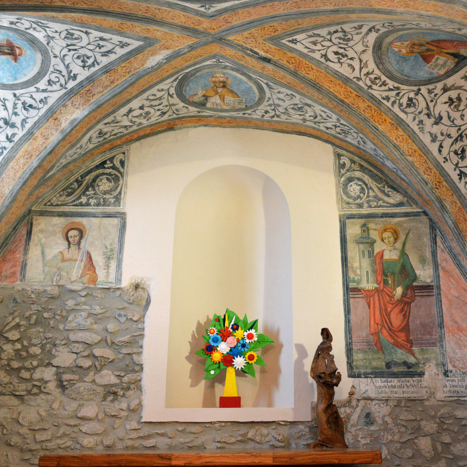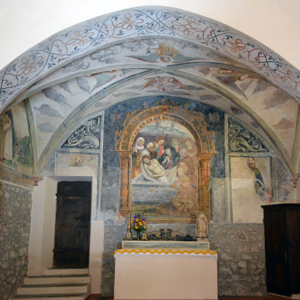 Lungo la strada che porta alla Sacra di San Michele, alle pendici del monte Pirchiriano, sorge l’ex Convento di San Francesco, noto oggi come Certosa 1515 e gestito dal Gruppo Abele. La chiesa conventuale, consacrata nel 1521, sorge al centro dello splendido complesso ed è tutt’oggi officiata. Essa si presenta esternamente con una semplice facciata in pietra a vista rifinita ad intonaco nella parte sommitale e impreziosita dal portale ad arco a tutto sesto e dal finestrone. Si conservano tracce della decorazione cinquecentesca, nella lunetta di facciata, dove si trova l’immagine della Pietà: la Vergine sorregge il corpo di Cristo appena deposto dalla croce. L’interno è strutturato a navata unica, sulla quale si innestano delle cappelle laterali poste sul lato sud. La struttura conserva ancora l’impianto primitivo, ad eccezione della prima campata, rialzata e munita di volta a cupola nella seconda metà del Settecento. Nelle cappelle laterali e nella lunetta sovrastante l’ingresso si conservano tracce dell’originaria decorazione ad affresco cinquecentesca. La prima cappella, a ridosso della facciata, è dedicata alla Concezione di Maria: decorata con elementi fitomorfi ad affresco ai lati di una nicchia, si vedono affrescate le figure frammentarie di Santa Lucia e Santa Barbara; nelle vele della volta sono raffigurati, all’interno di tondi, i ritratti dei padri della chiesa. La seconda cappella è dedicata alla Pietà di Cristo. Sulla parete frontale, inserita entro una finta architettura con arco a tutto sesto, si trova affrescata la scena della Deposizione, realizzata a partire da una composizione circolante nella bottega del pittore Defendente Ferrari. Sugli spicchi della volta sono invece rappresentati quattro angeli con i simboli della Passione di Cristo. Alla parete laterale è invece affrescato l’incontro tra San Francesco e San Domenico. L’intera decorazione della cappella è stata eseguita tra il 1515 e il 1521, da una bottega di ambito vercellese.