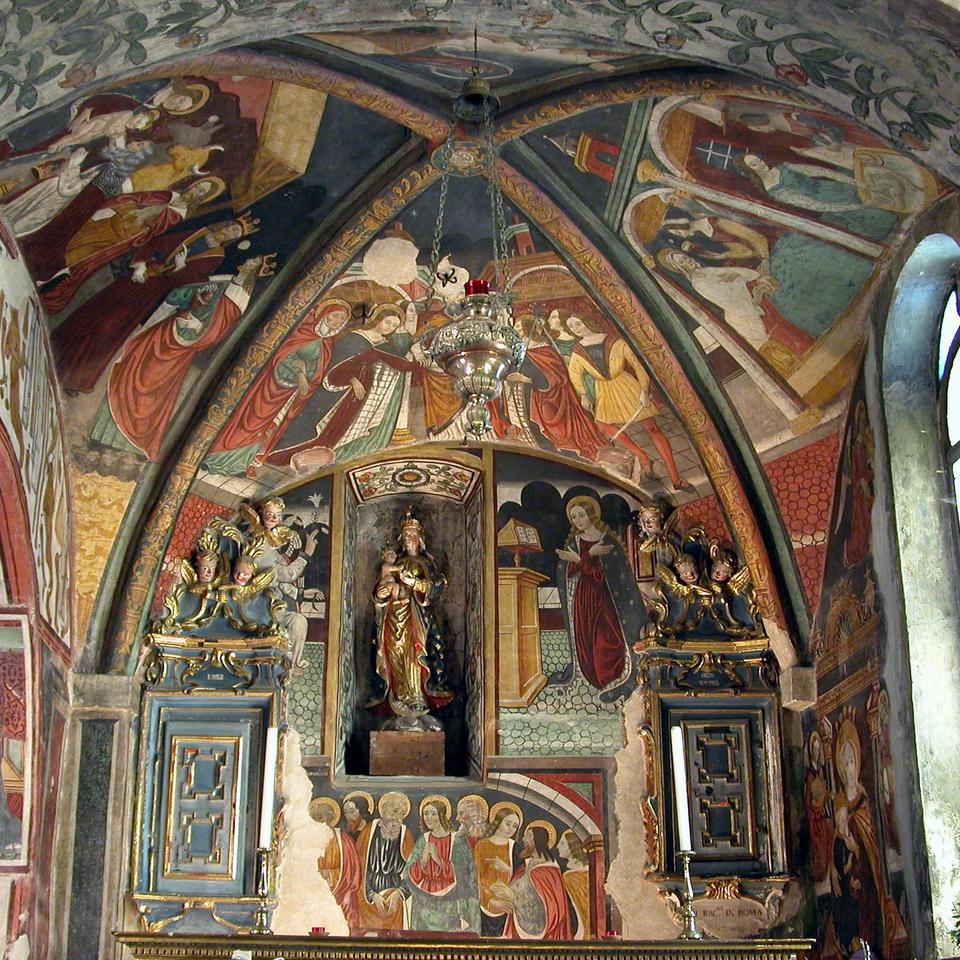 Verso la fine del XV secolo fu dato inizio ai lavori per la costruzione delle navate laterali evidenziando così lo stile Gotico, e contemporaneamente ebbe inizio la stesura degli affreschi che furono completati solo nel 1542 con la grande Crocifissione sulla parete di destra del presbiterio.