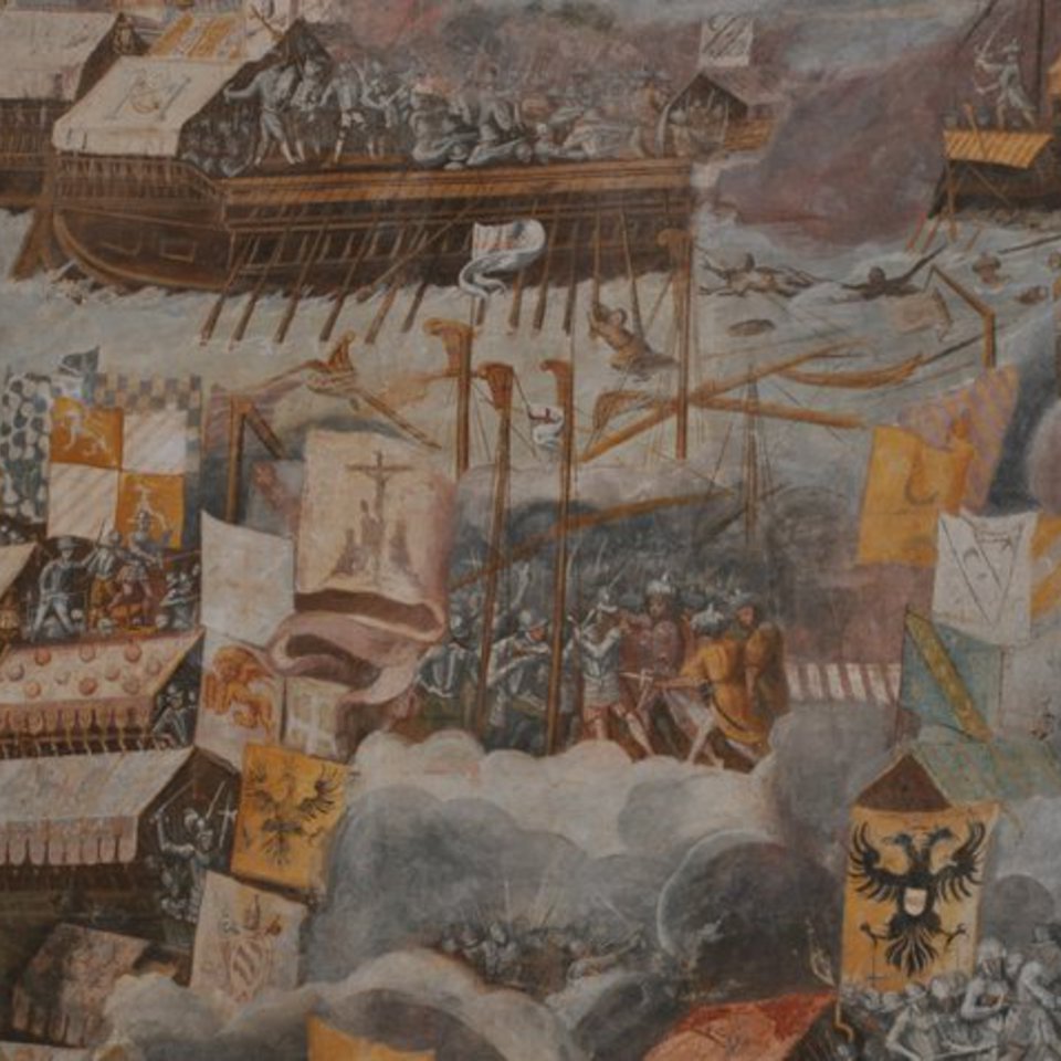 In fondo alla navata destra si trova un grande affresco della Battaglia di Lepanto della fine del XVI secolo.