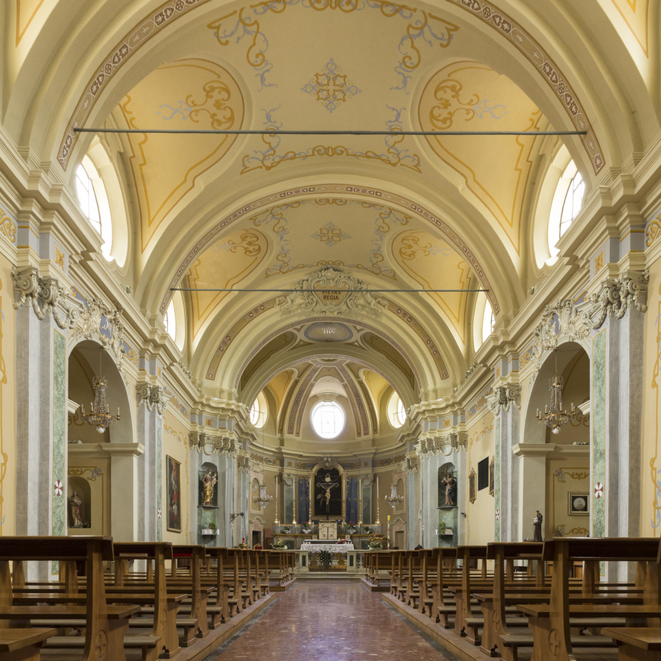 All'interno, l'esecuzione del soffitto con volta a botte, così come l'ampliamento del coro, sono frutto del progetto dell'architetto Gariglietti, redatto nel 1773, e del cantiere lavori affidato al misuratore Saverio Belli, che la completava nel 1774. Il tutto andava a sostituire un precedente soffitto in legno.