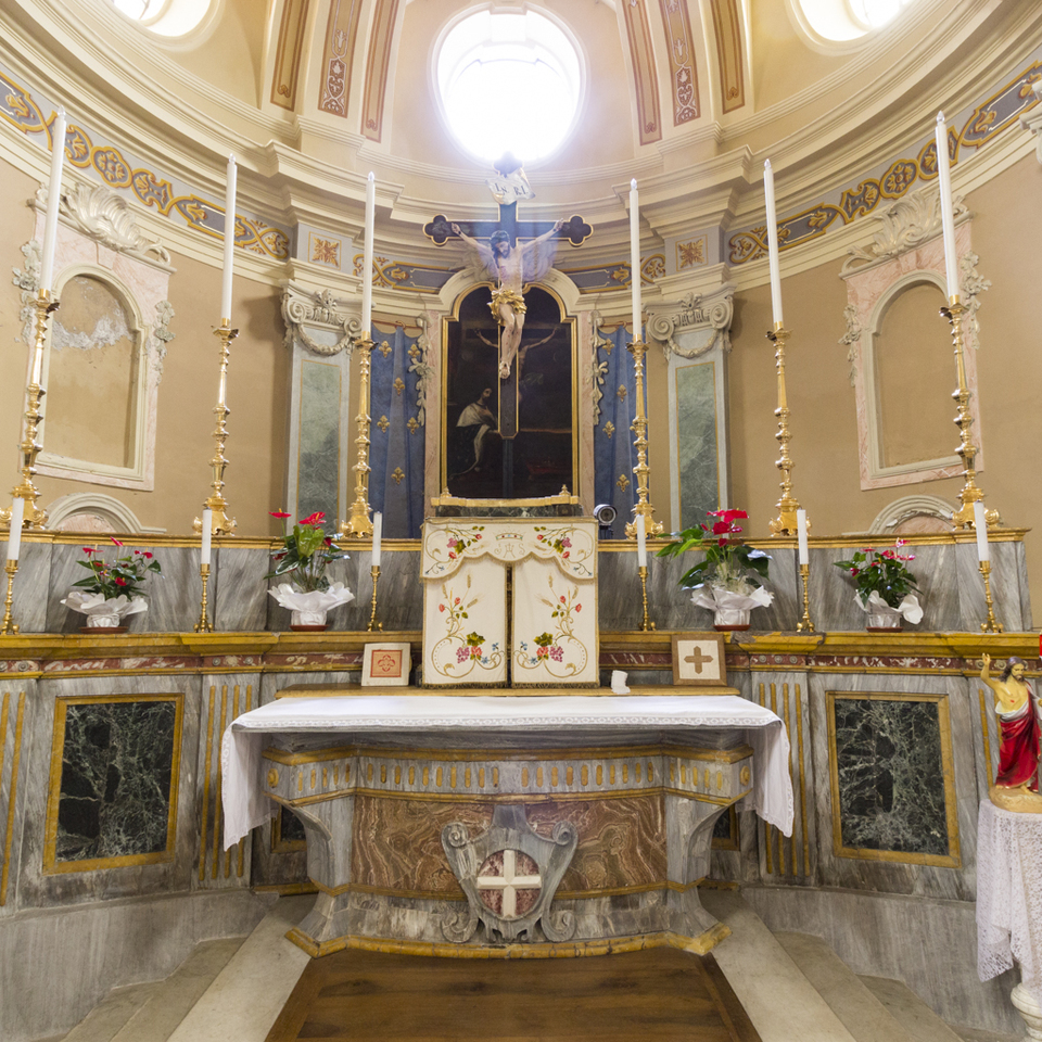Nell'area presbiteriale, l'altare maggiore tridentino è in muratura con dipinti marmorizzati, completo di tabernacolo, crocefisso e dodici candelabri. Dietro è la pala d'altare che raffigura san Luigi IX ai piedi del Cristo crocifisso. In posizione avanzata è una mensa lignea barocca, mentre in adiacenza al presbiterio, lateralmente, si conserva una tela di S. Carlo Borromeo donata dal card. Pacca, segretario di di Stato di Pio VII, che subì la prigionia nel forte di Fenestrelle.