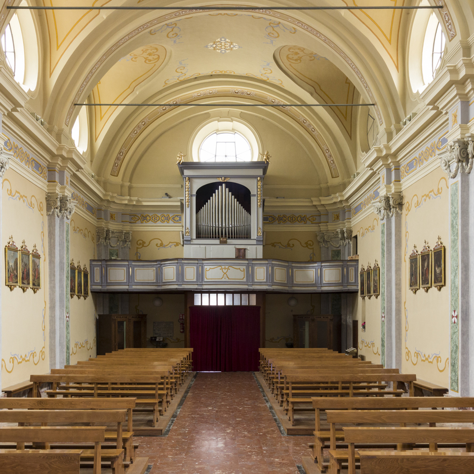 Sulla parete di fondo è appoggiata una bussola, con sopra cantoria lignea che ospita un organo dei fratelli Collino (abili artigiani organari, originari di S. Pietro Val Lemina, operanti nel Pinerolese e in Piemonte), costruito nel 1848.