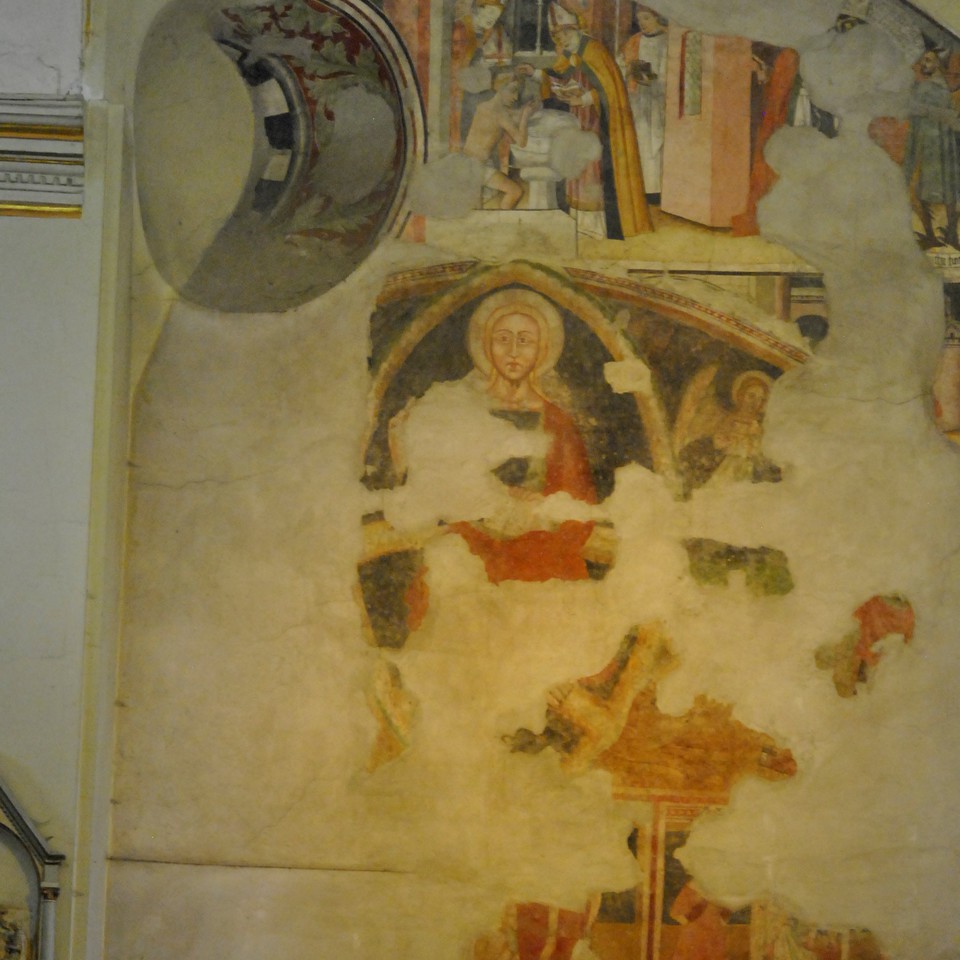Al di sopra, della secona metà del XV secolo, al centro un Cristo Pantocratore nella mandorla e scene dalla vita di san Martino recentemente attribuite al pittore Giovanni Canavesio.