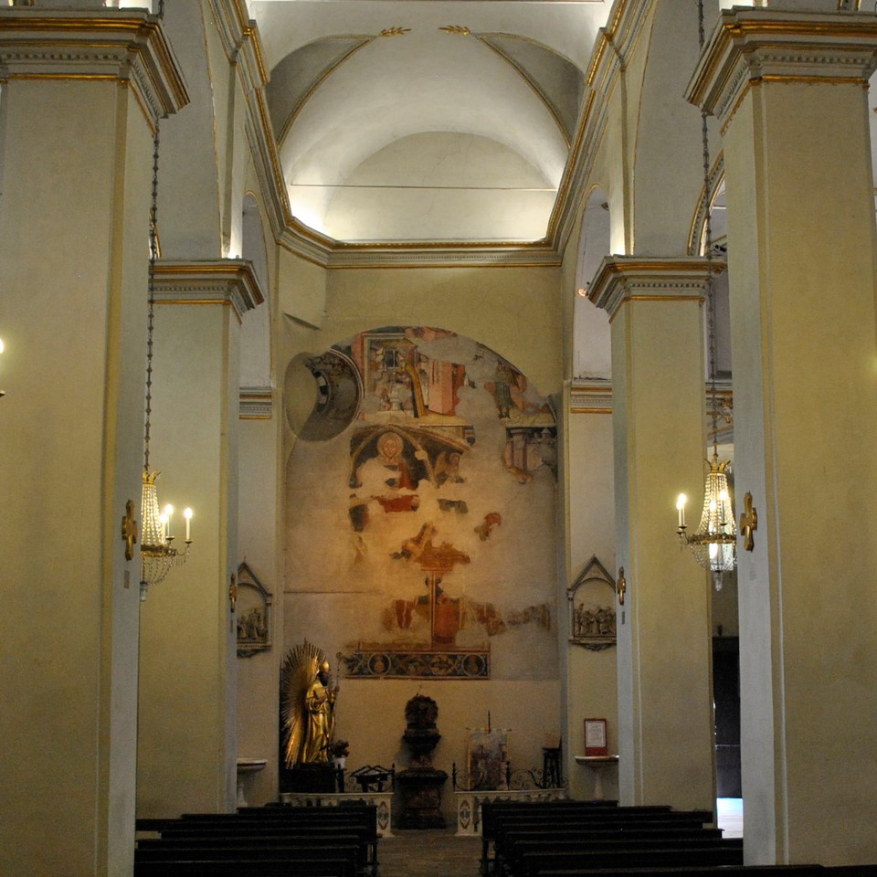 Nell'interno, sulla controfacciata addossata alla torre campanaria, sono affiorati sotto intonaci e scialbature, durante i restauri del 1971, resti di antichi affreschi.