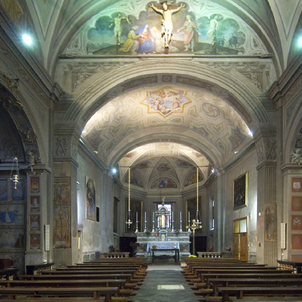 L’interno è il risultato di diversi interventi con affreschi del XV secolo, paliotti d’altare nelle cappelle laterali aggiunte nel 1700, dipinti di vari autori del XVI. Sulla volta centrale al pregevole Crocifisso ligneo del XVI secolo fa da sfondo una visione del Golgota affrescata a metà ottocento. Affreschi del XV secolo, lungo due lesene, con sant’Ambrogio e sant’Antonio Abate.Nella terza cappella sulla destra, la Cappella del Crocifisso, si trovano due dipinti di Defendente Ferrari, probabilmente parte di un polittico: l’Adorazione della Vergine e la Circoncisione.
