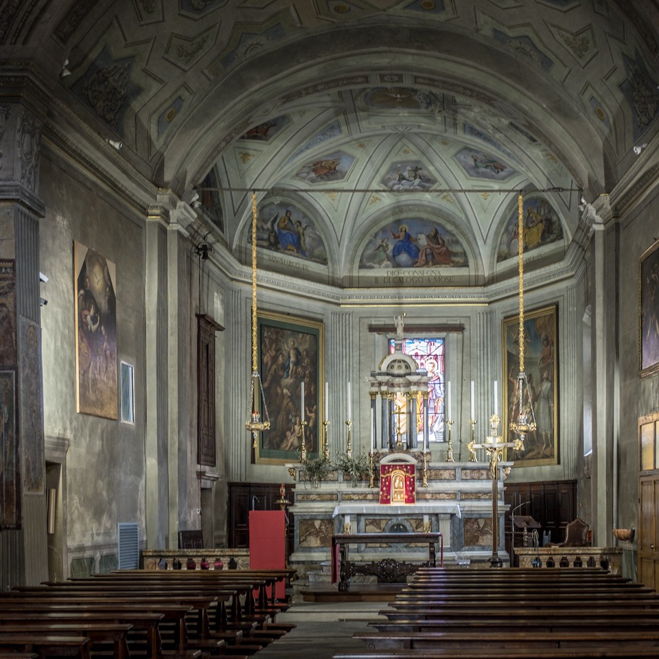 BATTISTERO La datazione del V secolo, proposta da alcuni autori, deve essere ancora documentata da specifici scavi archeologici. L’esterno si presenta come un edificio settecentesco, preceduto da un portico con colonne di granito La pianta esterna è quadrata cui corrisponde uno spazio ottagonale interno con nicchie alternate rettangolari e semi circolari ricavate nello spessore della muratura. È sormontato da un tiburio ottagonale che mostra all’esterno una volta a spicchi, su arco ribassato e che poggia su mensole in pietrade corate a motivi vegetali stilizzati, probabilmente romanica. Le decorazioni ad affresco della volta, del tiburio e delle pareti sono state realizzate tra il Quattrocento e l’Ottocento.