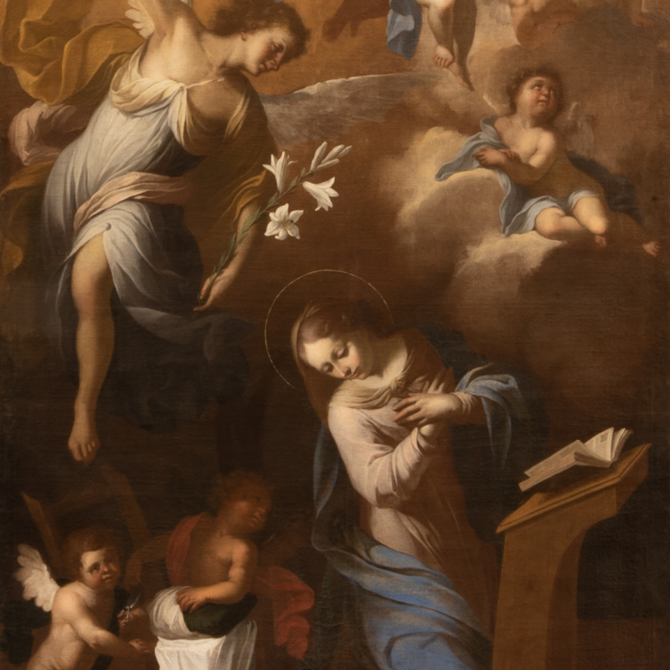 Come spesso accadeva in ambito laico, i Battuti tra il XVII ed il XVIII secolo decidono di rivolgersi ad alcuni tra i più ragguardevoli artisti presenti nel Piemonte sabaudo per celebrare Maria. Tutto l’apparato iconografico è infatti destinato ad esaltarla. Domina la scena la struttura lignea dell’altare maggiore. Un’opera poderosa affiancata ai lati da due passaggi simmetrici predisposti per l’accesso al coro e dorata nel 1699 da Giovanni Antonio Lomello di Torino che i Libri dei Conti documentano già prima del 1685, anno dell’ingrandimento della chiesa. Al centro è incastonata la tela dell’Annunciazione. Secondo i registri della Confraternita si data 1689 il contratto e la quietanza di pagamento al pittore cheraschese Sebastiano Taricco.