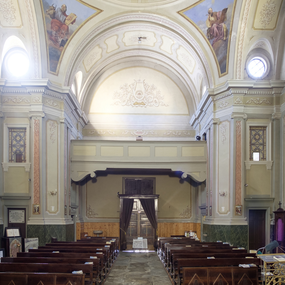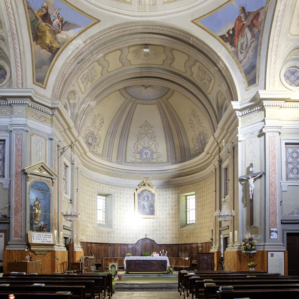 L’interno, con pianta centrale a croce greca, è caratterizzato da una volta a cupola compresa tra due volte minori a botte, e in fondo un catino absidale sferico. Ai fianchi è una cappella laterale per parte sormontata da volta a botte. Sulle pareti d’intorno sono disposte lesene con capitelli ionici e trabeazione incorniciata di gusto risorgimentale.