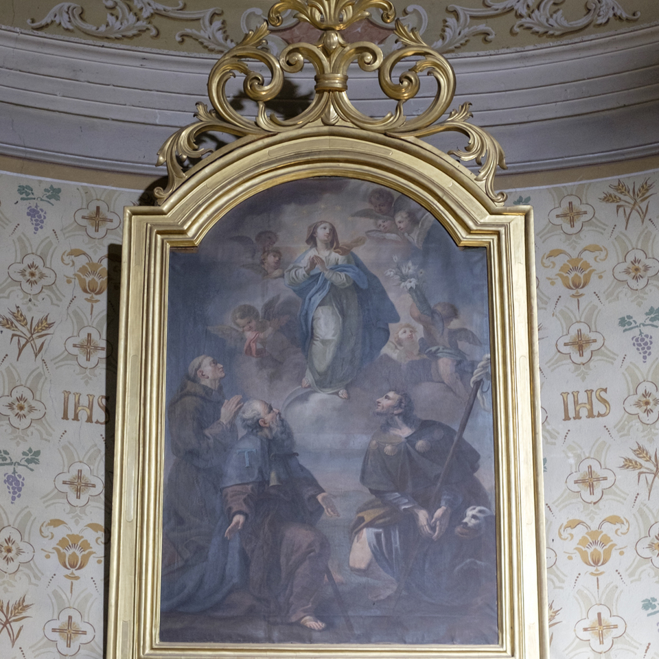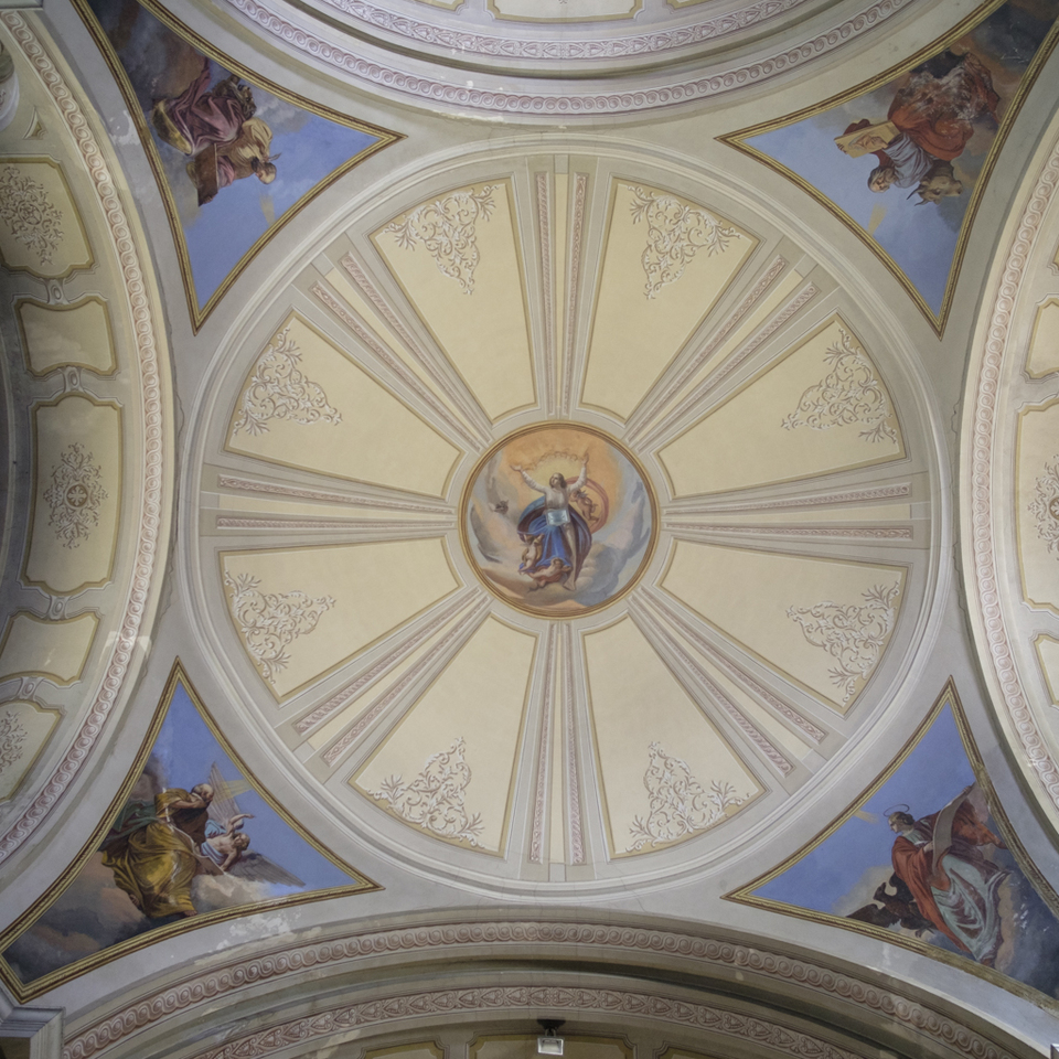 Chiesa di Sant’Antonio: La volta è ornata da archi pittati che convergono nel tondo centrale dove spicca l’Assunzione al cielo della Vergine Maria sostenuta da angioletti gaudenti; ai margini pennacchi contenenti i quattro evangelisti.