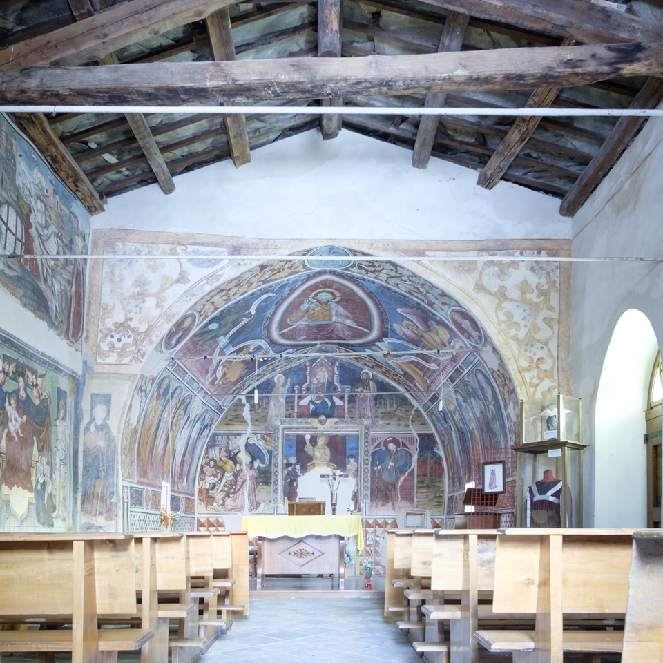 Cappella di San Bernardino: Le pareti del presbiterio sono affrescate nella seconda metà del XV secolo da un pittore anonimo, detto Maestro di Lusernetta, la cui mano si ispira alla tradizione jacqueriana.