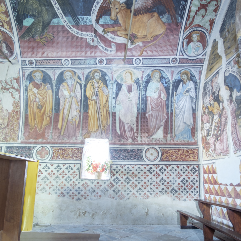 Sulle pareti laterali dell’abside si trovano i dodici apostoli, sei per lato e di grandi dimensioni, inseriti in altrettante nicchie, su ciascuna delle quali è riportato il nome. Sulla volta absidale trova posto il Cristo in mandorla con gli attributi degli evangelisti.