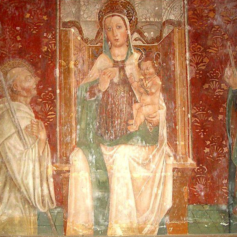 Tra i vari Santi raffigurati negli affreschi, che ancora oggi ornano le pareti della chiesa, si trovano quelli più diffusi e vicini alla cultura popolare e contadina del territorio (San Sebastiano, San Rocco, Santa Lucia, San Bernardo, San Cristoforo, San Bovo, ecc.). Un curioso soggetto, quello della “Lactatio Virginis”, è testimonanza della devozione a San Bernardo: la Vergine è rappresentata in trono col Bambino in grembo e dal suo seno sprizza una goccia di latte verso le labbra di San Bernardo inginocchiato. Si tratta di uno dei temi iconografici più curiosi, e inquietanti, che vedono protagonista Bernardo di Chiaravalle. L’allattamento simbolico del dottore mellifluo da parte della Madonna. Un fatto miracoloso, attribuitogli dopo la sua morte, che rappresenta, per così dire, l’autorizzazione suprema a predicare, l’investitura più alta.