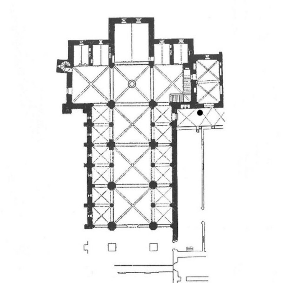 Il braccio destro del transetto comunica sia con la sacrestia, sia con il dormitorio dei monaci, al piano superiore, mediante una scala a doppia rampa.