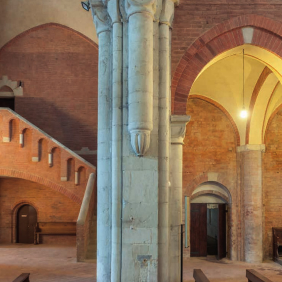 L’orientamento dell’edificio segue rigorosamente la regola liturgica antica, che prevedeva lo sviluppo della navata sull’asse est-ovest. L’altare a est, illuminato dal rosone dell’abside, perché clero e popolo potessero celebrare l’eucaristia rivolti a oriente, verso il vero “Oriens”, il sole che sorge sulle tenebre del mondo, che è Cristo.