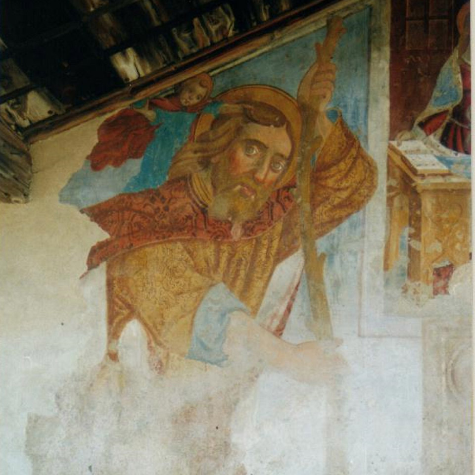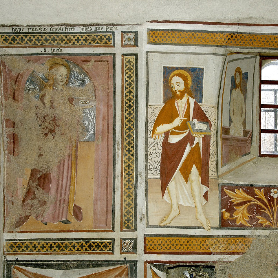 La cappella, come quella di San Sisto a Pian del Colle, presenta ancora un impianto liturgico antico, con la separazione dell'area del presbiterio da quella destinata al popolo con una cancellata lignea. Nella parete del presbiterio è rappresentato San Grato, vescovo di Aosta vissuto nel V secolo. Secondo la “Magna Legenda” fu lui a ritrovare in Terrasanta la testa di San Giovanni Battista, con cui viene rappresentato, una preziosa reliquia che era rimasta nascosta in un luogo segreto all’interno del palazzo di Erode. Lì giunto, Grato la ritrovò prodigiosamente in fondo ad un profondo pozzo. La nascose sotto il mantello, e salutato il patriarca di Gerusalemme, tornò in Italia e portò, con il consenso del Papa, il capo di San Giovanni Battista ad Aosta.