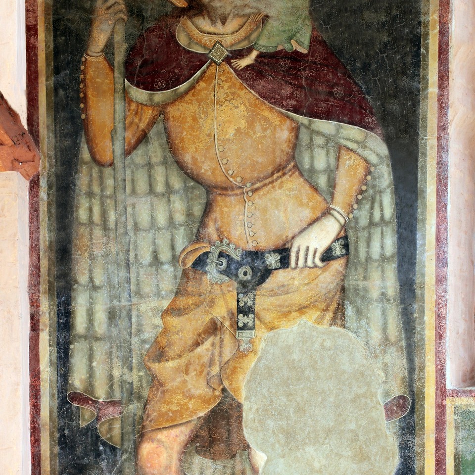 La maestosa figura di Cristoforo, che regge sulla spalla sinistra il Cristo in veste di fanciullo, campeggia sulla facciata principale, dipinta nel terzo decennio del XV secolo, e ripetuta più avanti nel secolo, seppure in minori dimensioni, in controfacciata, a protezione dei viandanti, invocato contro le morti improvvise.