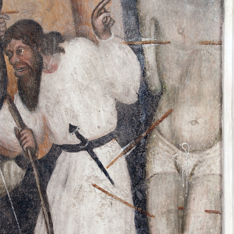 Le pareti della seconda cappella di destra sono decorate dalle Storie di san Sebastiano, invocato contro la peste, assegnate a Pietro da Saluzzo.