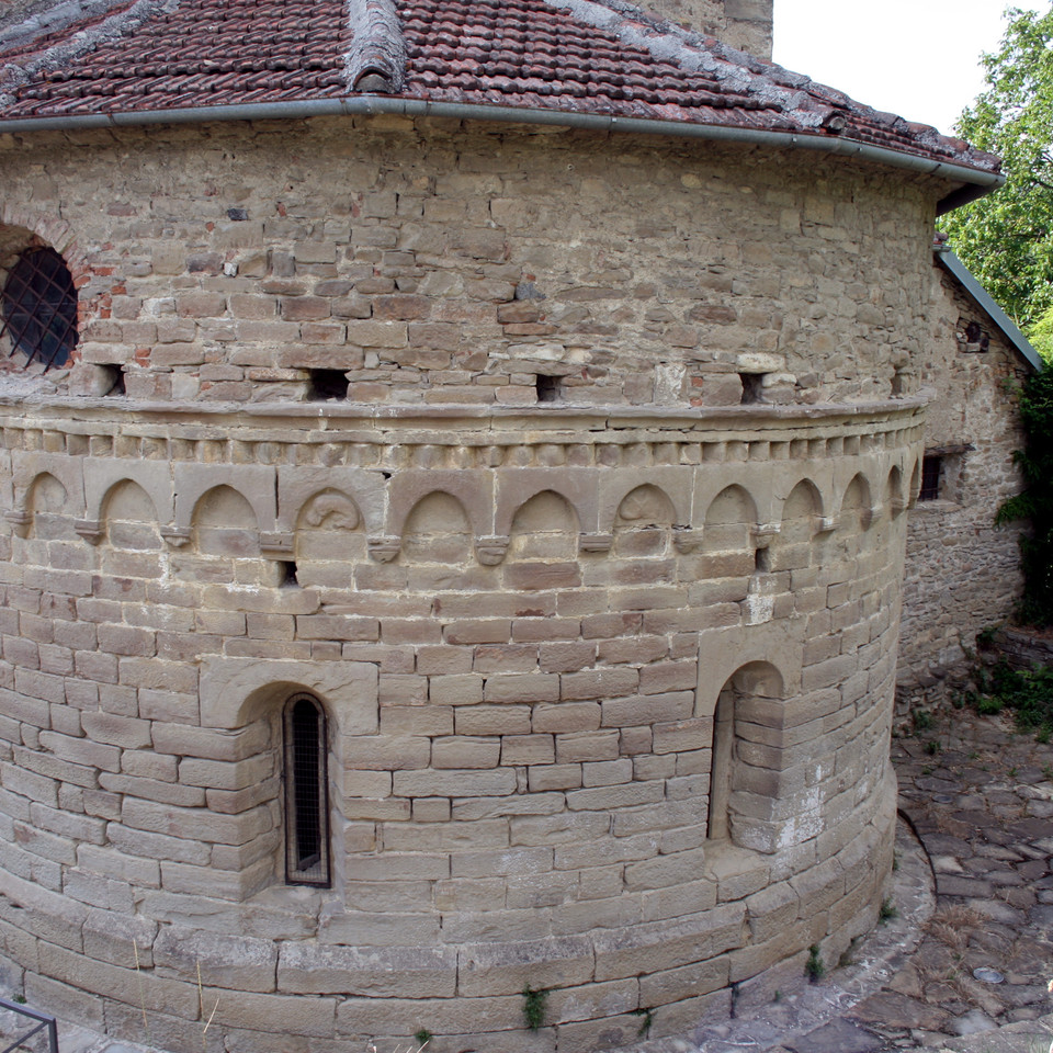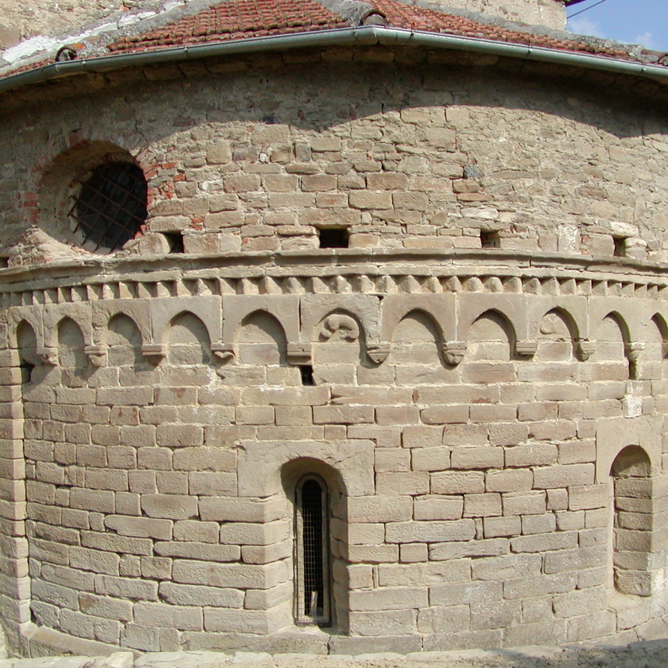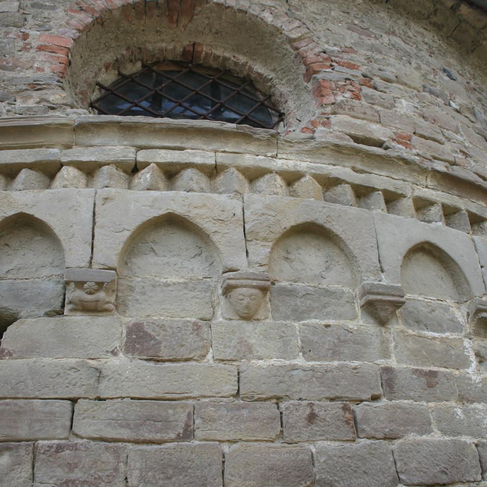 La massiccia torre campanaria scandita da monofore e da registri sovrapposti di archetti pensili ciechi si impone per l’austera maestosità sul fianco destro dell’edificio. Da segnalare, in quanto immediatamente visibile a chi si accosti all’edificio giungendo dalla stradina di accesso, è la duecentesca abside, ornata da una teoria di archetti pensili sostenuti da mensoline con motivi zoomorfi, fitomorfi e figurati. Il repertorio in origine ricco e complesso è solo parzialmente sopravvissuto all’erosione e al tempo. Si individuano ancora palmette, sirene, animali ed elementi antropomorfi che animano la rigorosa tessitura in pietre perfettamente squadrate.