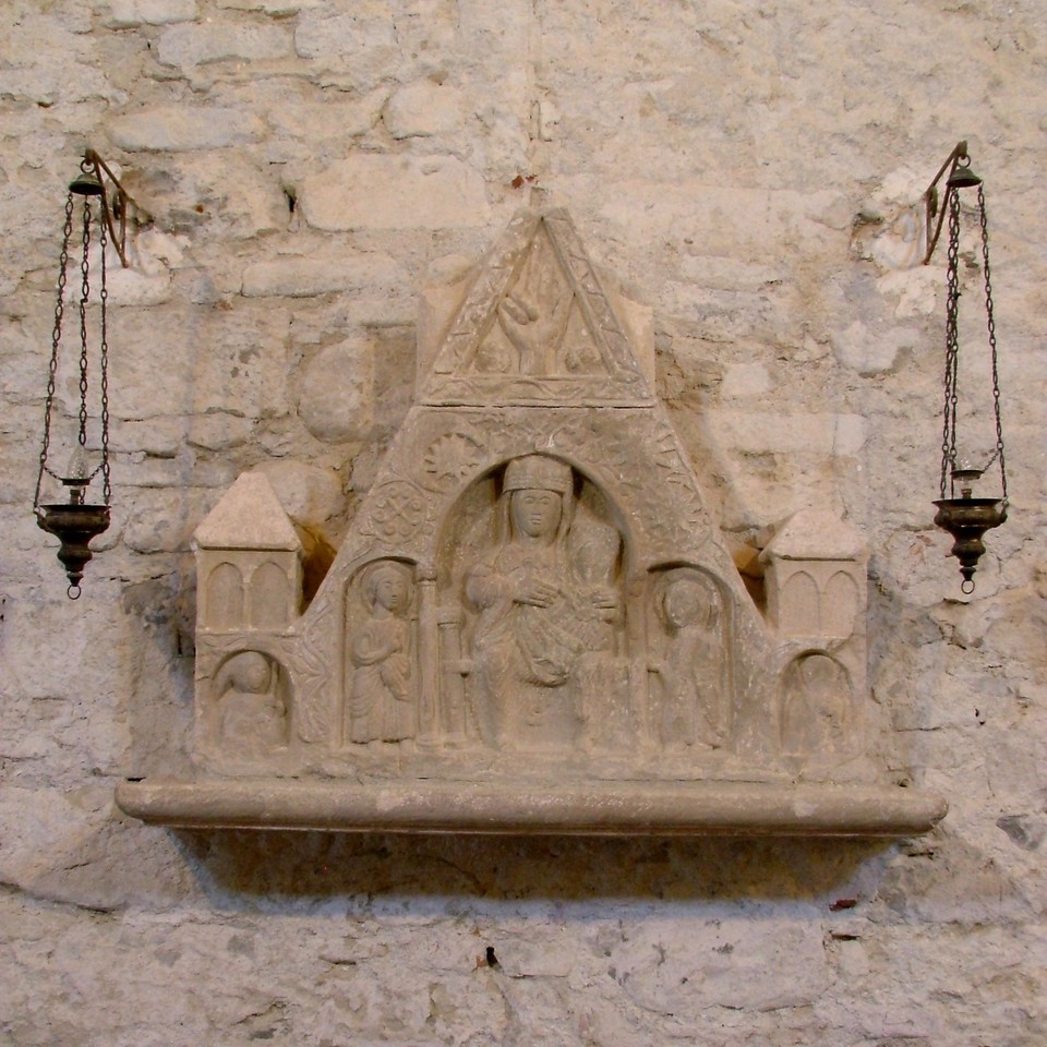 La pieve di S. Maria presenta una remota titolazione mariana e questa devozione, pur non essendo suffragata dal ricordo di eventi miracolosi legati al sito, è riscontrabile anche nella più antica testimonianza scultorea presente nel sacro edificio.
