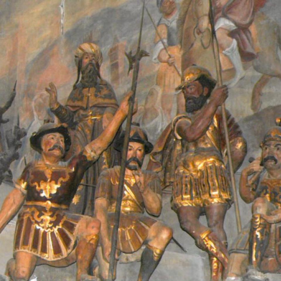 La chiesa della Maddalena di Novi Ligure, edificio sacro della Compagnia dei Disciplinati, conserva ancora oggi una grandiosa raffigurazione del Calvario, una composizione che impegna tutto lo spazio absidale a più livelli, culminando nella scena della Crocifissione che si svolge alla sommità. Quando un tempo, il Venerdì Santo, si celebrava una rappresentazione sacra, la statua del Cristo, dotata di braccia snodate, veniva deposta dalla croce e collocata sul Calvario. I due gruppi scultorei, il Compianto e il Calvario, molto diversi tra loro per stile e materiale, fanno parte di un unico intento devozionale e didascalico, collegabile ai dettami della Chiesa della Controriforma e allo spirito dei Sacri Monti: imprimere nei fedeli la devozione per il luogo sacro in cui morì il Salvatore, predicare attraverso le immagini sacre che dovevano risultare molto realistiche e drammatiche.