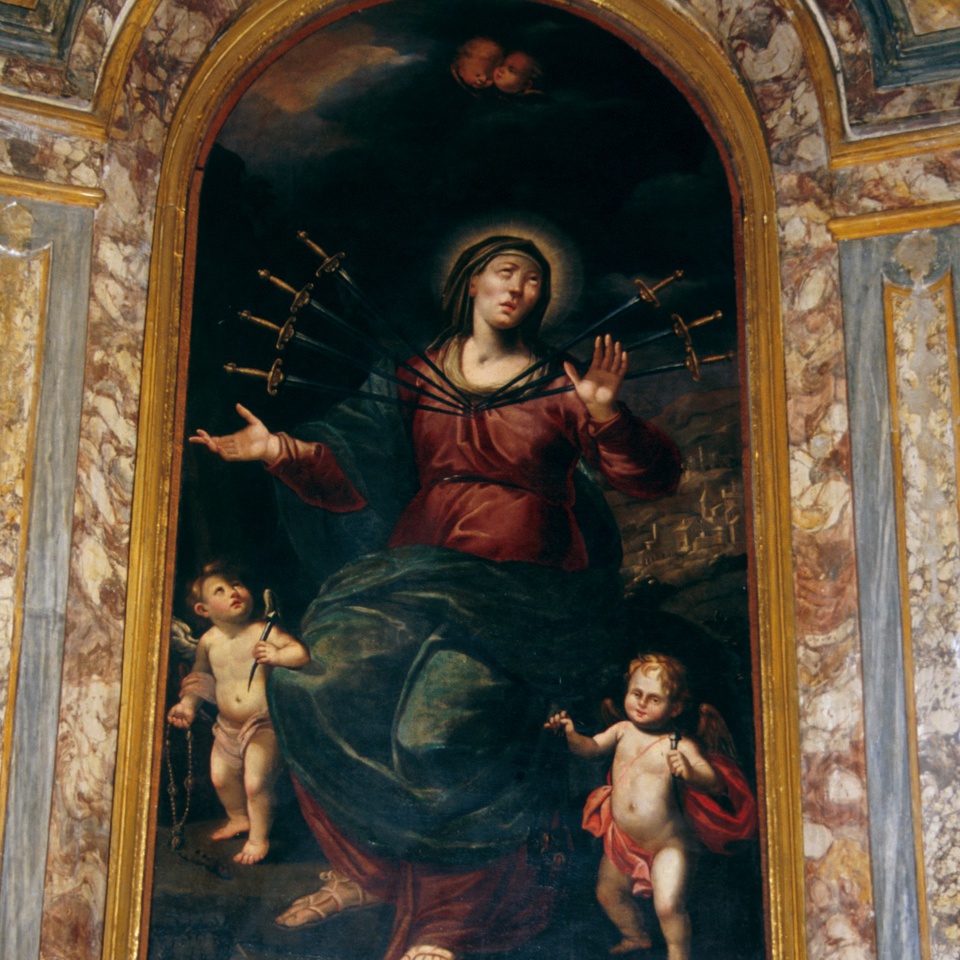 Il dipinto raffigura la Vergine con le braccia aperte, il volto dolente rivolto al cielo ed il petto trafitto da sette spade, divise in due fasci, simboleggianti i sette dolori da lei sofferti: tre legati all’infanzia di Gesù, cioè la profezia di Simeone, la fuga in Egitto, la ricerca di Gesù al tempio, e quattro alla Passione, la salita al Calvario, la crocifissione, la deposizione dalla croce e quella nel sepolcro. Ai lati della Madonna due angioletti portano in mano gli strumenti della passione di Cristo. Ritroviamo lo stesso soggetto in una settecentesca statua lignea vestita.