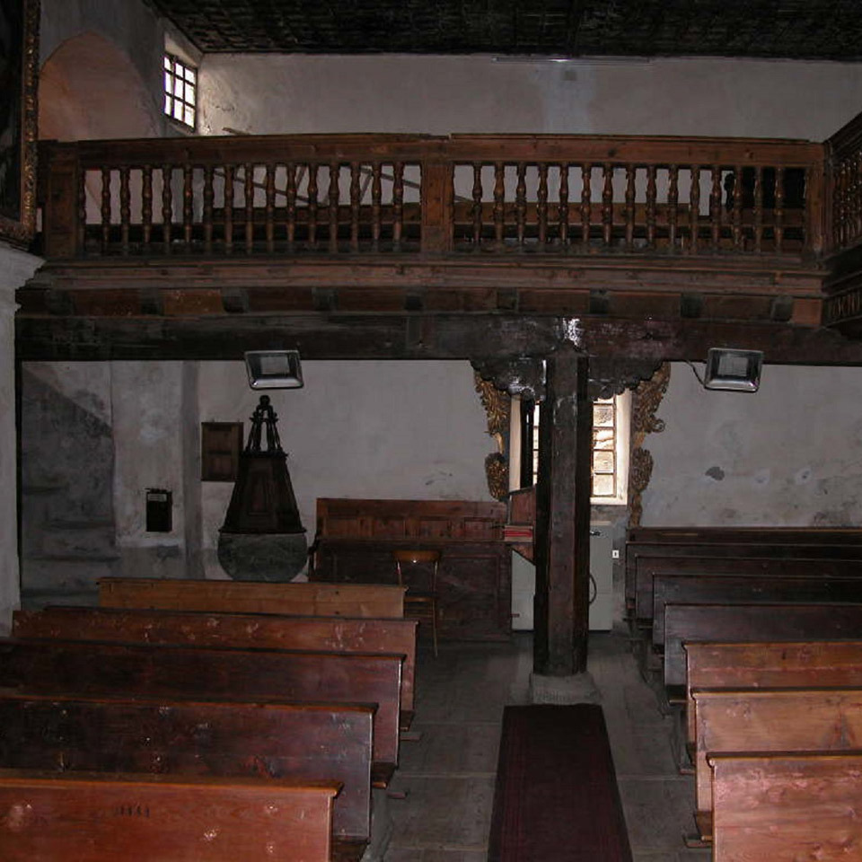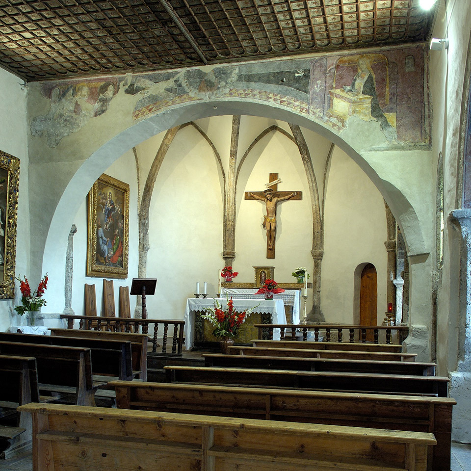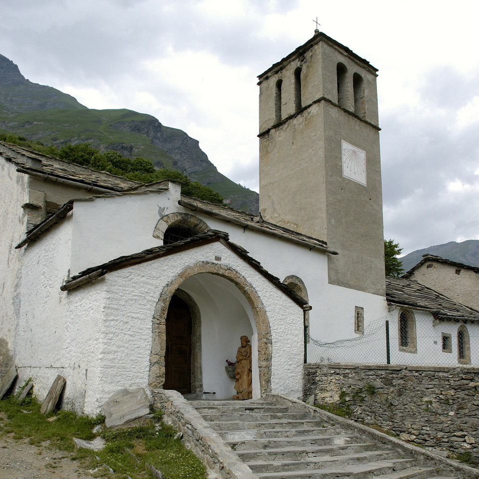 Le prime notizie sulla parrocchiale di Rochemolles risalgono al 1296, tuttavia le forme attuali dell’edificio sono l’esito di una riplasmazione avvenuta tra XV e XVII secolo. Il piccolo pronao di accesso è stato edificato nel 1699. L’esterno presenta forme molto semplici, con pareti in pietra intonacate di bianco che mettono in evidenza le cornici in tufo delle finestre. Il campanile, appartenente all’impianto quattrocentesco, ha perduto le originarie forme romanico-delfinali a causa di una valanga che, nel 1749, ne asportò completamente le guglie. Attualmente presenta una struttura tronca, con un massiccio basamento segnato, nella parte meridionale, da una piccola feritoia e da una meridiana. L’interno è scandito da due navate: quella principale termina con un’abside poligonale, mentre la minore con la cappella di San Sebastiano. L’ambiente è dominato dalla presenza di due significative opere di carpenteria lignea: il soffitto a cassettoni decorato con motivi policromi a stella e a fiore, realizzato a cavallo tra Quattro e Cinquecento, e la cantoria risalente al 1758 ma con modiglioni del XVI secolo. La cappella di San Sebastiano custodisce alcuni affreschi con la Storia della vita del santo e le figure di San Sisto e Sant’Apollonia, realizzati nei primi anni del Cinquecento dal cosiddetto Maestro del Coignet e della Ramats, un anonimo artista legato agli stilemi espressi dalla bottega dei pinerolesi Serra ma dotato di una personalità artistica autonoma. Anche l’Annunciazione, recentemente scoperta sull’arco santo, presenta affinità con l’analogo soggetto presente nella cappella di Sant’Andrea a Ramats e gli affreschi che decorano il pilone campestre di Pra Lavin, località sita a monte di Rochemolles in direzione della borgata Mouchequite. Alla fase di arredo cinquecentesca risalgono anche il fonte battesimale, il badalone del leggio corale, datato 1571 e, pur con elementi di reimpiego, le tre sedie per officianti presenti nel presbiterio. È invece datato al 1621 il leggio corale, decorato con il monogramma di Cristo, i simboli della passione e un motivo floreale ad intarsio su un lato e un sole affiancato da due strutture turrite a bassorilievo sull’altro. Risalgono infine ad una fase di riarredo collocabile tra la fine del XVII e l’inizio del XVIII secolo tre preziosi dipinti recanti ricche cornici ad intaglio: la Madonna col Bambino tra i Santi Pietro e Paolo, del 1698, e la Madonna del Rosario con i Santi Domenico, Antonio abate e Caterina da Siena, datati 1703 e commissionati dal prevosto Faure e portanti la firma di Gabriel Dufour. Anche l’Assunzione tra i Santi Rocco e Sebastiano può essere ricondotto allo stesso clima culturale.