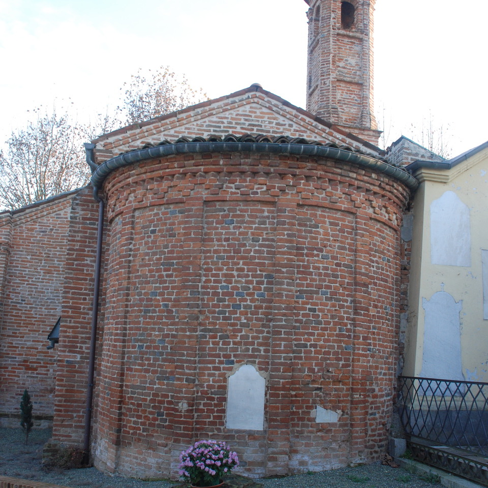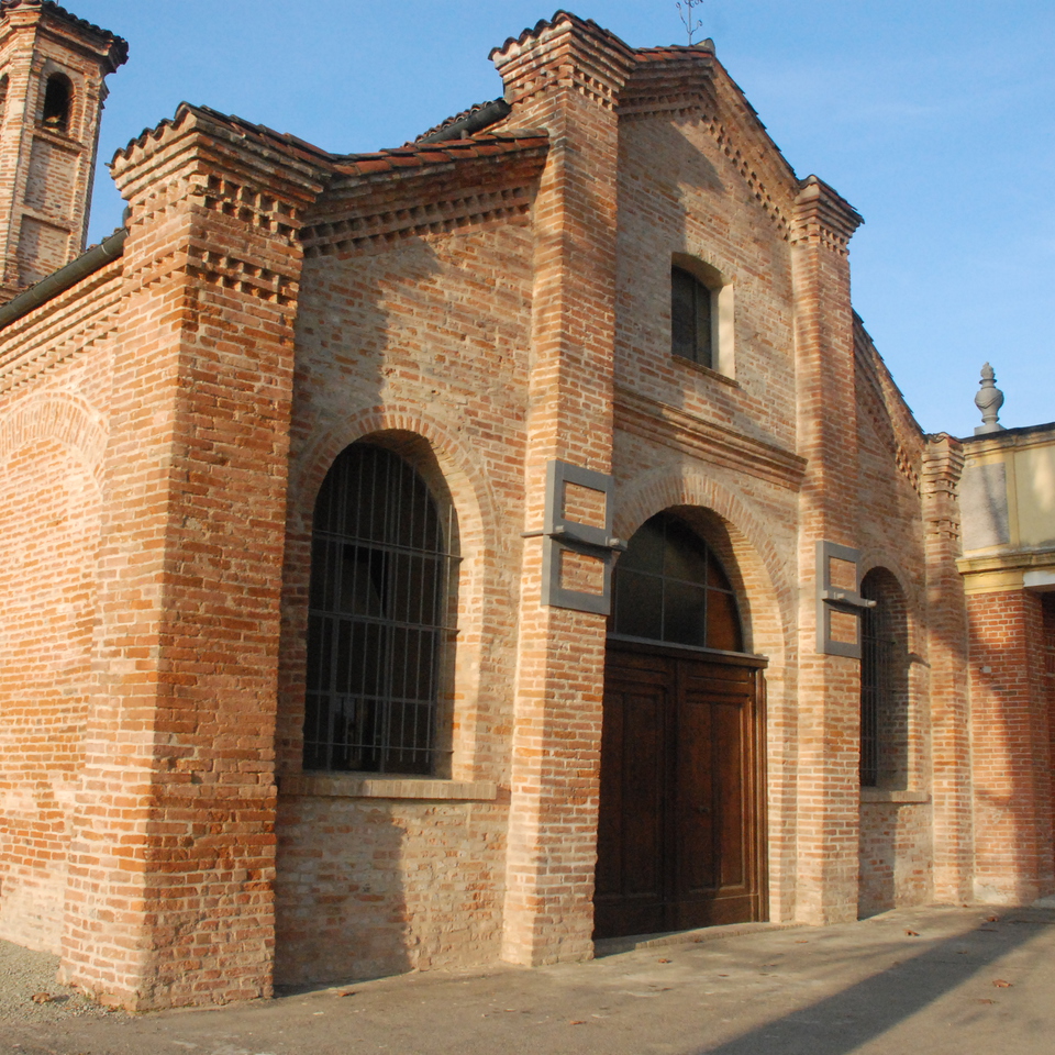 La chiesa campestre dedicata a San Rocco, protettore dei pellegrini e degli appestati, faceva parte di un lazzaretto volutamente collocato fuori dal paese di Felizzano. Essa risale al XVI secolo quando fu edificata su un precedente edificio, nelle sembianze attuali; il campanile risale all’anno 1774 mentre l’adiacente Camposanto al 1813. L’edificio è a tre navate, di cui quella centrale coperta da un’ampia volta a botte, mentre le due laterali sostengono volte a vela e a crociera. La navata centrale è conclusa da un’abside semicircolare e voltata a crociera. Le pareti interne sono intonacate, la controfacciata è caratterizzata da tre ampie finestre ad arco. La pavimentazione è in formelle in cotto disposte a spina di pesce. In esterno, tutto in mattoni a vista, la facciata a salienti è articolata da quattro lesene che scandiscono in esterno la ripartizione interna. Lungo tutto il corpo di fabbrica si sviluppa un cornicione in cotto che avvicina l’edificio ad architetture trecentesche presenti sul territorio. Il ciclo di affreschi absidale riproduce, nella parte alta, il Pantocrator. Il Cristo, benedicente, poggia la mano sinistra sul mondo sormontato dalla croce. Ai lati sono rappresentati i simboli degli Evangelisti. Nell’emiciclo absidale è raffigurata la Madonna in trono con il Bambino tra i Santi: per primo San Rocco, che si appoggia al bastone del viandante e con la mano destra solleva la tunica a mostrare la piaga della gamba. Accanto si intravede un frammentario San Michele Arcangelo, con le ali, l’armatura e parte della lancia. Dall’altra parte del trono sono visibili San Sebastiano, riconoscibile dalle innumerevoli flagellazioni, e San Pietro. Per ultimo San Lorenzo, è qui rappresentato con la dalmatica, una tunica lunga fino ai piedi con stola a tracolla trapunta di croci e tiene nella mano sinistra una catena. Queste pitture, databili intorno al XVI secolo, rimandano all’ambito culturale lombardo, che si sviluppò attorno alle figure di Bramante e Bramantino e presentano consonanze sia con i soffitti dipinti di Palazzo Inviziati ad Alessandria, sia con gli affreschi della Cappella del Rosario nella Parrocchiale di San Felice nella vicina Frugarolo. (Relazione Arch. Antonella Caldini)