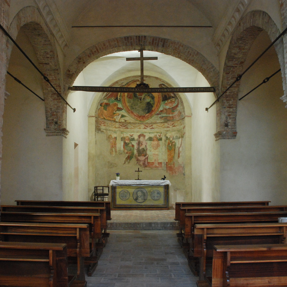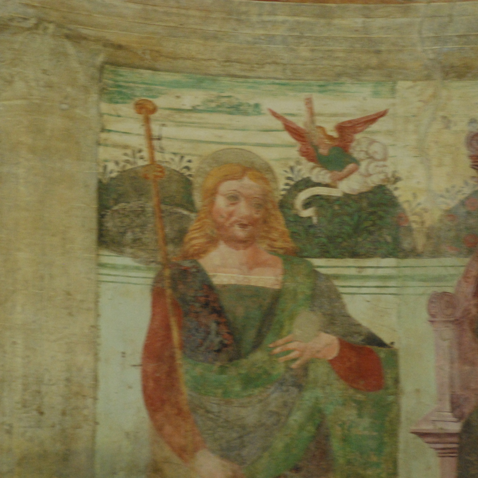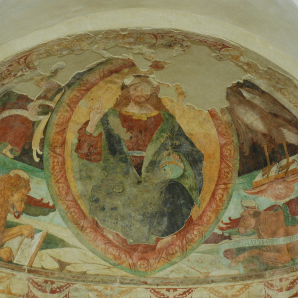 Nel catino absidale, L’Ev. Matteo ha sembianze umane, è dotato delle ali degli angeli ed è rappresentato in ginocchio mentre regge un cartiglio con scritto LIBER GENERATIONIS JESU CHRISTI FILI. L’Ev. Marco è un leone: ha la bocca aperta dalla quale esce la lingua guizzante e sul dorso sono riprodotte le ali rosse e verdi. Tiene aperto il libro su cui si legge APPARUIT ILLIS JESUS. L’Ev. Giovanni è un’aquila, di colore grigio, che poggia gli artigli su un libro aperto sul quale si legge: IN PRINCIPIO ERAT VERBUM. L’Ev. Luca, rappresentato come il bue alato, con la zampa sinistra ferma un cartiglio che reca l’iscrizione: MISSUS EST ANGELUS GABRIEL A DEO IN CIVITATEM GALILEAE. La disposizione a forma di “X” degli Evangelisti richiama l’idea delle virtù cardinali. Ireneo di Lione (fine II secolo) ha per primo collegato il quaternario con i Vangeli, segnalando come il leone esprima il concetto della regalità, il bue del sacrificio, l’uomo dell’incarnazione e l’aquila dello Spirito che sorregge la Chiesa. E’ stato invece San Gerolamo (fine IV secolo) ad associare gli animali agli Evangelisti. Il Vangelo di Matteo inizia con l’incarnazione ed è simboleggiato dall’angelo o uomo, probabilmente perché egli insiste sull’umanità di Gesù; Marco comincia con la figura del Battista, “Voce di uno che grida nel deserto”, potente e solitaria come il ruggito di un leone; Luca pone l’accento sul tema del sacrificio sopportato da Zaccaria, reso muto per la sua incredulità, pertanto gli si addice il bue o toro; Giovanni, infine, compie con il suo Prologo al Vangelo, un volo spirituale talmente alto e con vista così acuta, da risultare simile a quello di un’aquila. Nelle tradizioni esoteriche a queste figure vengono solitamente associate particolari qualità sapienziali: l’Uomo alato rappresenta l’intuizione della Verità; il leone, il fuoco, la forza e il movimento; il bue, la terra, la resistenza e il sacrificio; l’aquila infine, l’intelligenza e l’azione. E’ inoltre importante sottolineare la presenza di San Sebastiano insieme a San Rocco: l’elemento che li lega è il morbo della peste a rafforzare il ruolo importante del piccolo edificio campestre nato come anello di un percorso di edifici preposti all’accoglienza degli ammalati.