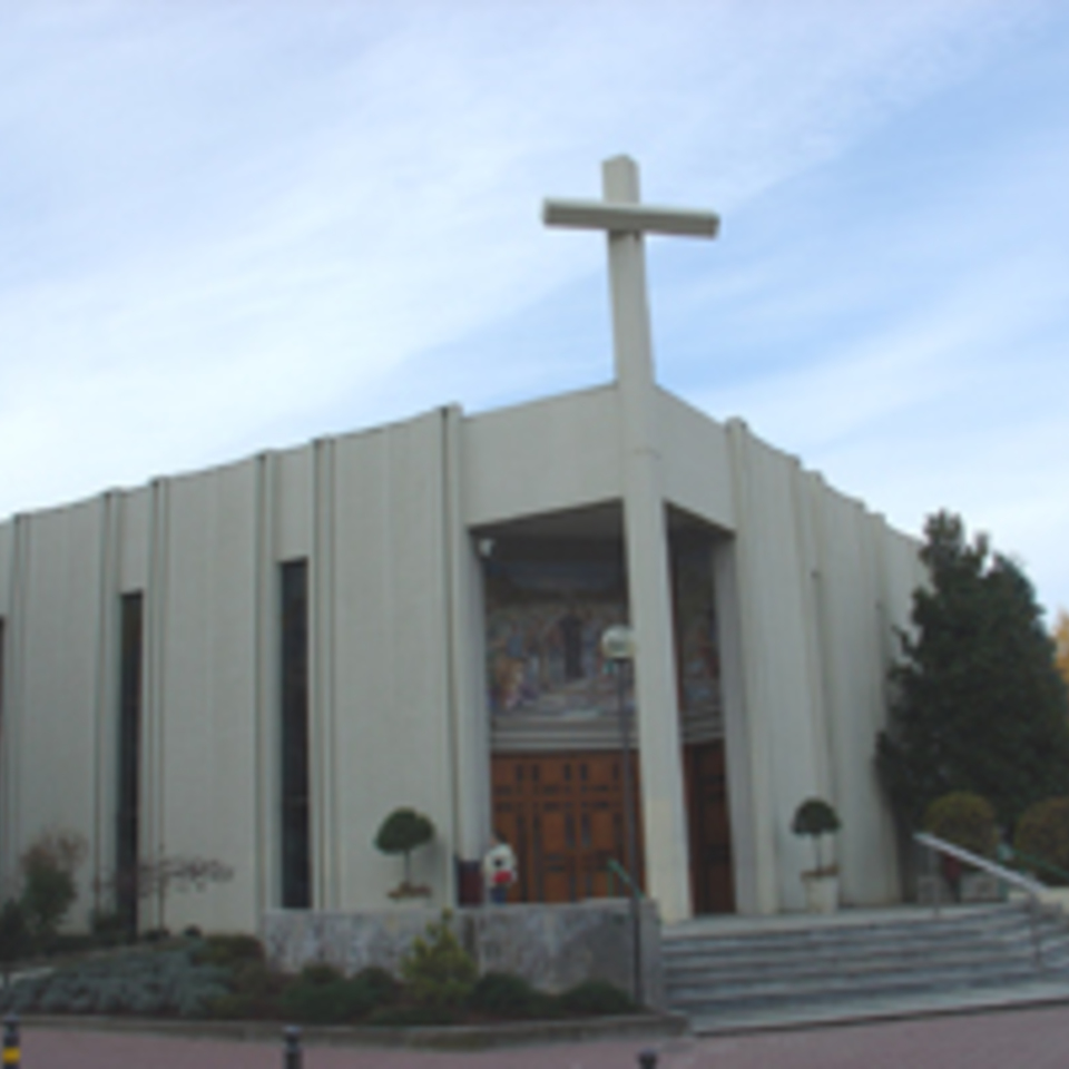 La sfida di trasformare un grande capannone prefabbricato in un luogo di celebrazione ecclesiale ha preso forma in modo più vistoso, non solo per l'imporsi all'interno dell'area presbiteriale, a più ancora per la presenza delle dodici vetrate disegnate con le figure degli Apostoli, che hanno conferito al grande cubo dell'edificio un richiamo emblematico alla Gerusalemme celeste. L'effetto di questa festosa città santa in cui si raduna il popolo dei salvati è più evidente dall'interno, nei momenti luminosi, con la convergenza dello sguardo verso il grande Crocifisso sul candore del presbiterio.