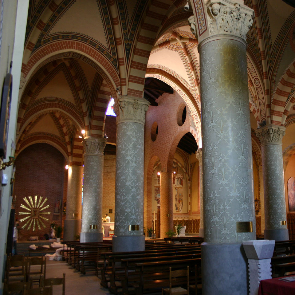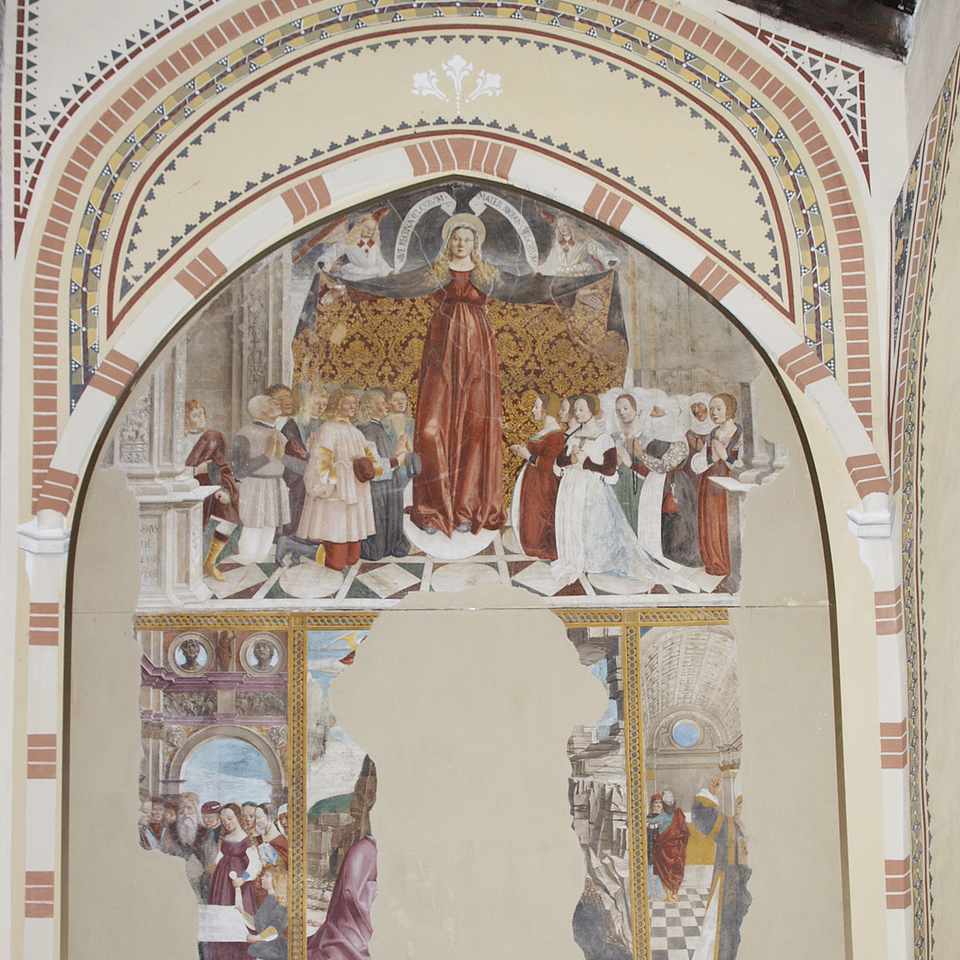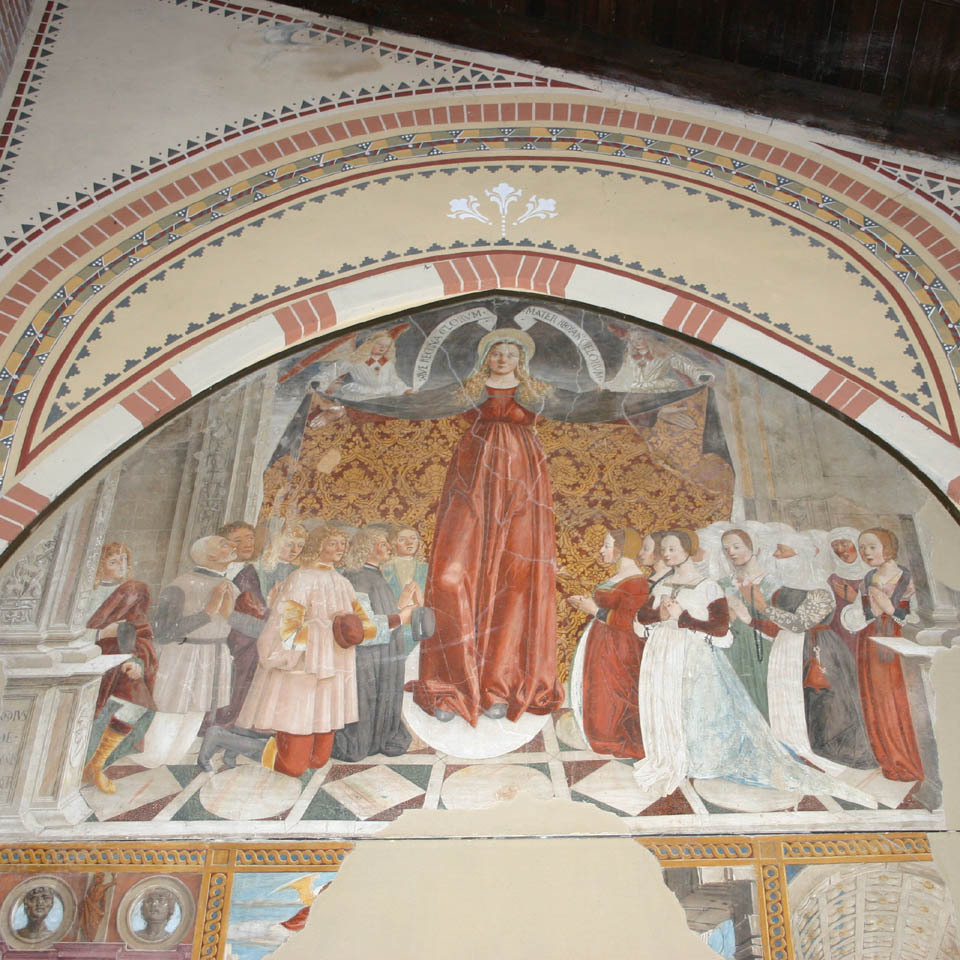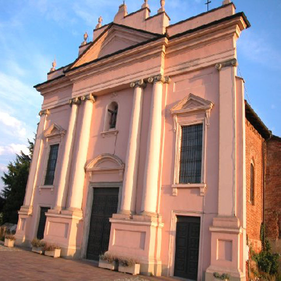 La chiesa parrocchiale di Frugarolo è dedicata a San Felice papa e la festa patronale è l’ultima domenica di luglio. Nativo di Benevento, fu eletto Papa per disposizione del re Teodorico nel 526, mentre a Costantinopoli saliva sul trono il più grande degli Imperatori d'Oriente, Giustiniano. San Felice IV morì nel 530 a Roma, dove trasformò due templi del Foro romano in una chiesa in onore dei santi Cosma e Damiano, prima basilica in Roma dedicata a santi orientali, e in questo si può forse ravvisare il positivo rapporto che il papa riuscì a mantenere anche con il partito favorevole all'impero orientale. Al fondo della navata destra la parete è decorata con una Madonna della Misericordia: La Vergine è raffigurata in piedi, in grandi dimensioni, mentre allarga il proprio mantello riccamente decorato per accogliervi, al di sotto, i fedeli inginocchiati. Si tratta di un retaggio dell'epoca medievale, detto della "protezione del mantello", che le nobildonne altolocate potevano concedere a perseguitati e bisognosi d'aiuto. Ciò consisteva appunto nel dar loro simbolico riparo sotto il proprio mantello, considerato inviolabile. L'iconografia ebbe un particolare successo presso le confraternite medievali e rinascimentali – periodo a cui risale il grande affresco - tra cui soprattutto le confraternite della Misericordia. Anche dopo la Controriforma il soggetto continuò a godere di un largo seguito, per le sue evidenti connotazioni devozionali.