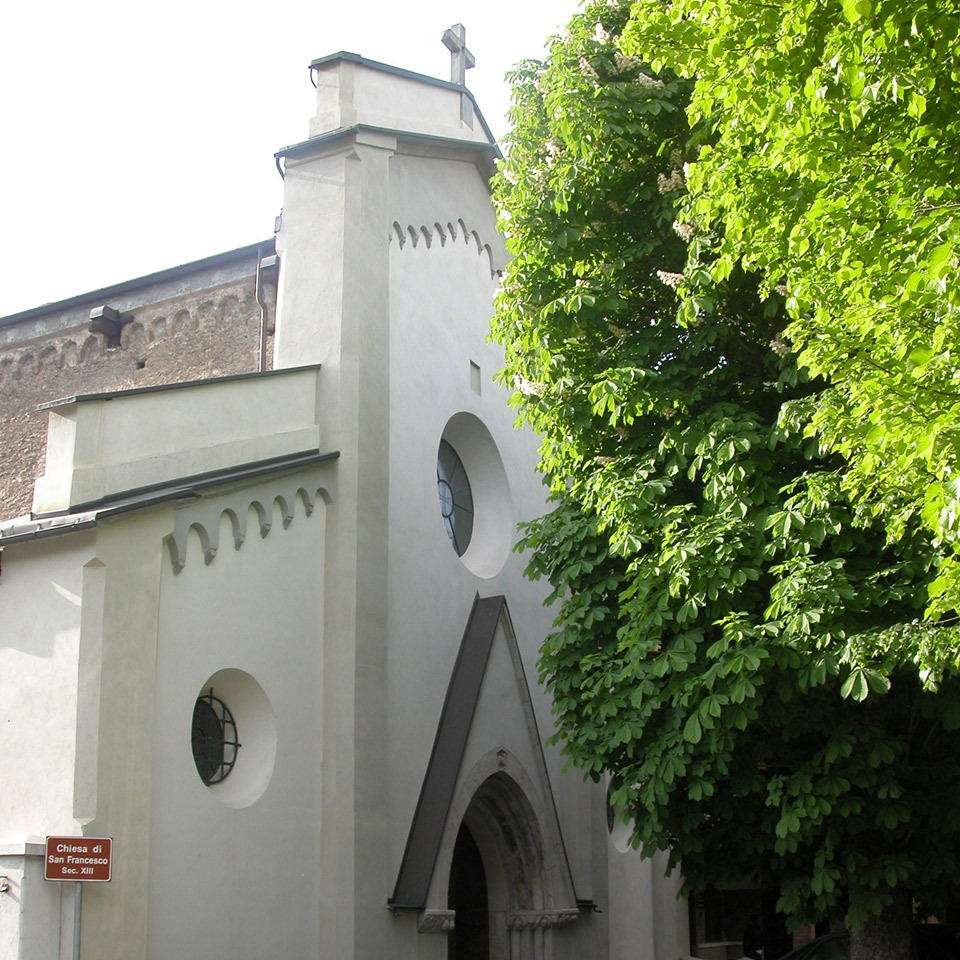 La chiesa e l'ex convento di San Francesco di Susa, edificati a partire dal secondo quarto del Duecento, furono fondati, secondo una leggenda, dallo stesso Francesco d’Assisi in occasione del suo passaggio a Susa nel 1214. Il convento francescano di Susa acquisì ben presto un importante ruolo sia in campo religioso che civile. Il periodo di maggior degrado si ebbe dopo il 180 quando, a seguito della soppressione degli ordini religiosi voluta dal governo francese, esso fu adibito a deposito di salnitro e ricovero per le truppe. Solo nel 1899 fu riaffidato ai frati francescani, per volere di Monsignor Rosaz, vescovo di Susa. Nel 2007 i francescani hanno lasciato l’edificio, ora in parte riconvertito a struttura di accoglienza per pellegrini. La chiesa, costruita intorno alla metà del XIII secolo, è articolata in tre navate e termina in un’abside poligonale a sette lati; possiede una facciata a salienti con ghimberga in arenaria che sormonta un portale con decorazioni scultoree del XIV secolo raffiguranti teste umane, animali e foglie. Il campanile, recentemente restaurato, era originariamente molto più elevato e fu decurtato degli ultimi livelli nel corso di un intervento in età moderna. L'interno, decorato in stile neogotico nel 1880-1887, conserva capitelli databili al XIII secolo e alcuni importanti cicli affrescati: la sacrestia vecchia presenta un ciclo con ritratti di santi francescani e San Francesco, Santa Chiara e San Ludovico da Tolosa, databili alla metà del XIV secolo,, mentre a lato dell'ingresso della sacrestia nuova sono presenti raffigurazioni degli Evangelisti, datati alla fine del XIV secolo, della Vergine, della Maddalena e di San Bernardo realizzati nel XV secolo. L’interno, decorato in stile neogotico tra il 1880 e il 1887 conserva anche tracce della decorazione antica, come il ciclo pittorico del XV secolo raffigurante gli evangelisti e gli apostoli Pietro e Paolo, eseguiti dai pittori Serra negli anni Ottanta del Quattrocento. La sala capitolare presenta un ciclo con santi e beati francescani databile intorno alla metà del XIV secolo, con un’interessante raffigurazione di San Francesco che riceve le stigmate. Infine, nella sacrestia nuova sono visibili le figure della Vergine, della Maddalena e di San Bernardo, ancora parzialmente sotto scialbo. Nella testata della navata sinistra, la cappella detta del Presepe, in origine dedicata ad usi funerari, presenta un ciclo affrescato di grande interesse, risalente alla metà del XIV secolo e recentemente riscoperto e restaurato, dedicato al tema della morte e della salvezza: particolarmente intense sono le raffigurazioni della crocifissione e la cavalcata dei tre vivi e tre morti. È di Guglielmo caccia detto il Moncalvo il dipinto raffigurante San Francesco in adorazione del Bambin Gesù. Nel chiostro maggiore, denominato di San Francesco, sono conservati antichi frammenti lapidei, come alcune epigrafi risalenti al XIII e XIV secolo. Si conservano, inoltre, due finestre in cotto quattrocentesche in stile gotico piemontese. Sul lato del chiostro contiguo alla chiesa si ammirano inoltre alcuni lacerti di un affresco quattrocentesco rappresentante Sant'Anna, la Madonna, il Bambino e una figura maschile.