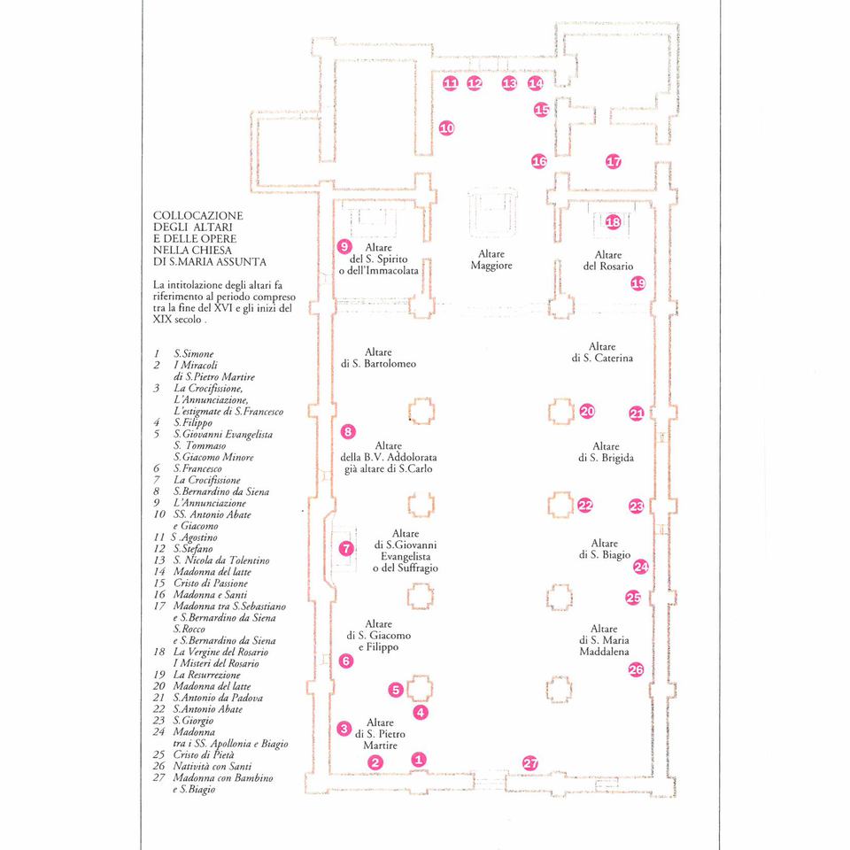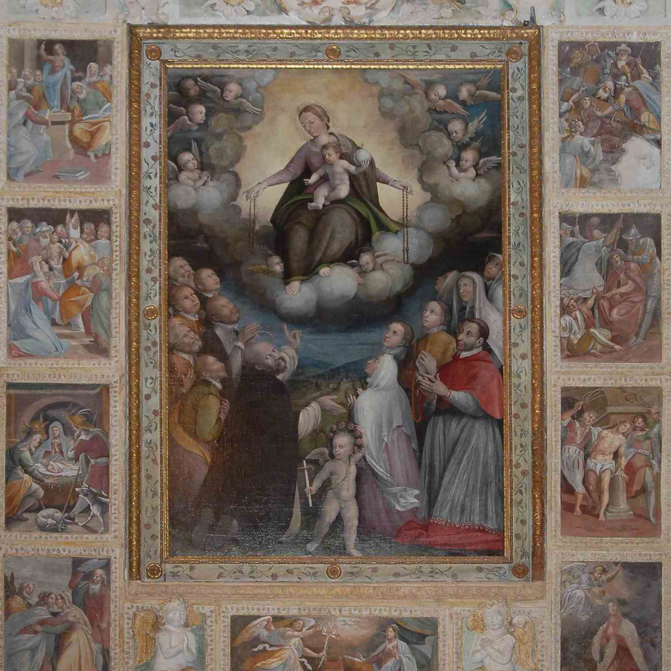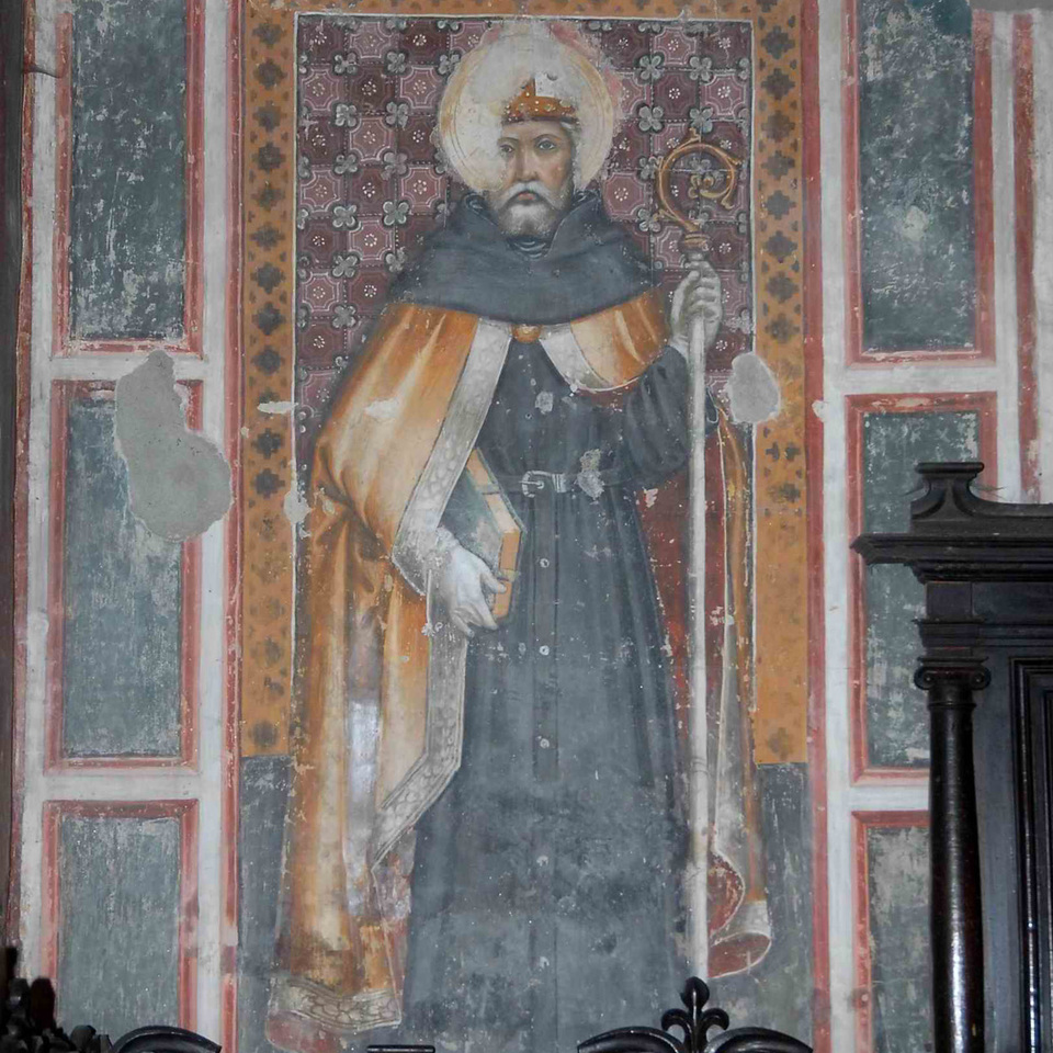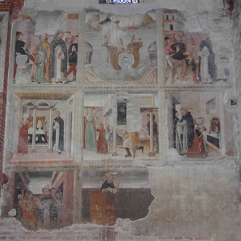 Tra i numerosi affreschi dell’interno è interessante il ciclo delle storie di San Pietro Martire. Pietro da Verona o Pietro Martire è un Santo domenicano, inquisitore in Lombardia martirizzato dagli eretici che combatteva nel 1252. Il suo culto ebbe grande espansione, i domenicani eressero chiese e cappelle a lui dedicate in tutto il mondo, le Confraternite ebbero in ciò un’importanza notevole. Parecchie città italiane lo elessero a loro protettore ed è uno dei santi più raffigurati. L'arte lo raffigura in abito domenicano, spesso con un libro in una mano e la palma del martirio nell'altra, trafitto da una roncola o un grosso coltello infilzato nella testa.