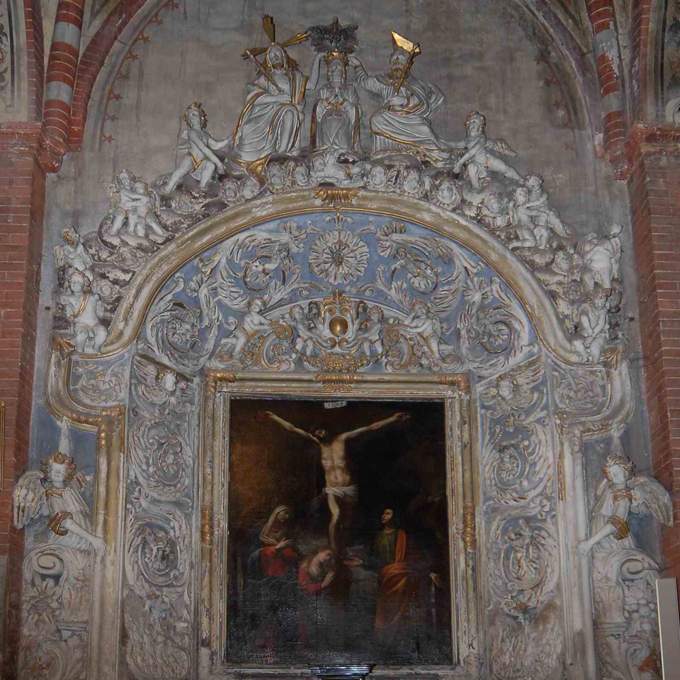 A metà della navata sinistra è posto l’altare di San Giovanni Evangelista o del Suffragio, riccamente decorato da stucchi e completato da un quadro raffigurante la “Crocifissione”. Alla metà del XVIII secolo risale l’altare maggiore in marmi policromi, tipico prodotto di maestranze lombarde. Nella parete destra del presbiterio si apre una porta che conduce ad una antica cappella, su cui alla fine del Cinquecento fu edificato il campanile: qui si trova lo strato più antico della decorazione pittorica risalente alla metà del Quattrocento. Al termine della navata destra è collocato l’altare del Rosario, di notevole pregio artistico per la presenza degli affreschi del Fiamminghino.