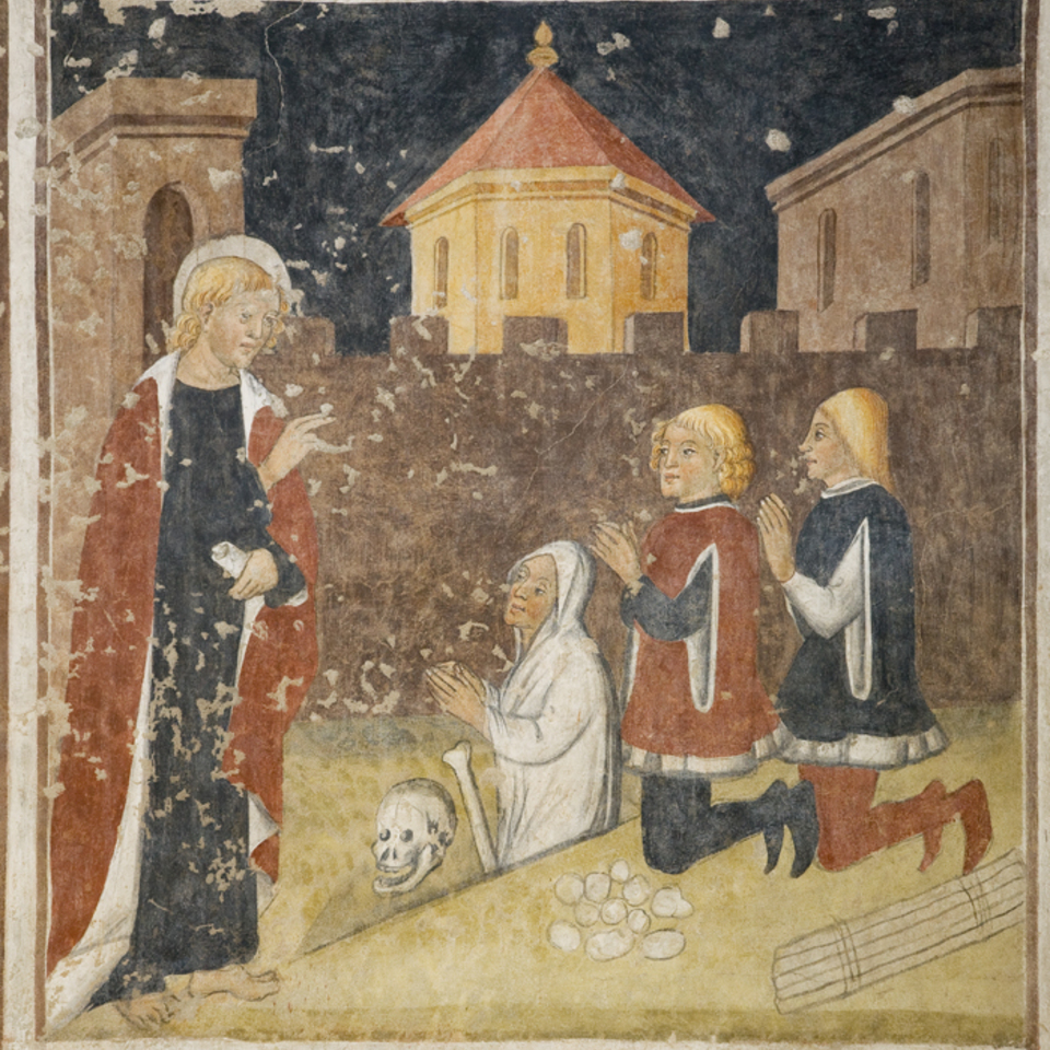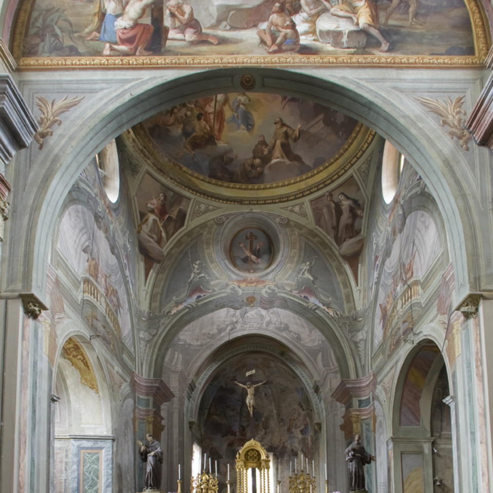 Il 20 agosto 1471 fu posta la prima pietra del complesso di San Bernardino, ubicato sulla collina saluzzese e destinato ad accogliere i Minori Francescani, secondo le intenzioni del marchese Ludovico I. Le testimonianze della fase più antica sono rintracciabili nel fregio in cotto all’esterno dell’abside, nelle mensole lapidee all’interno e negli affreschi della cappella di Santa Croce. A seguito dell’incendio devastante del 1529, venne fatto riedificare da Margherita di Foix, vedova di Ludovico II e reggente del marchesato. Nel corso del XVII secolo andò definendosi l’impianto della chiesa a navata unica su cui affacciano dodici cappelle, alcune delle quali conservano tracce della decorazione seicentesca, sopravvissute ai successivi aggiornamenti. Nel XVIII secolo furono intrapresi consistenti interventi strutturali e decorativi su progetto dell’architetto luganese Pio Poncino, tra i quali certo spiccano gli affreschi della Gloria di san Bernardino e di santa Margherita da Cortona, opera del 1755 di Pietro Paolo Operti da Bra.