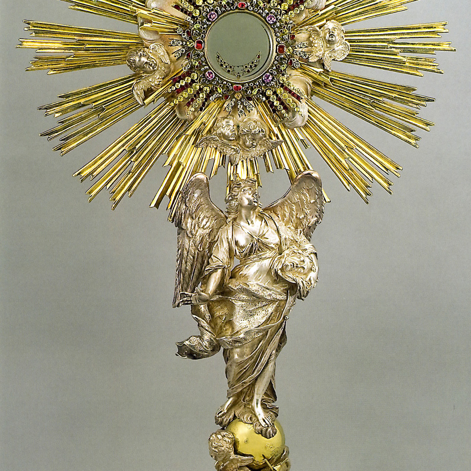 Ostensorio dell’Angelo con la testa del Battista opera di Francesco Ladatte: il superbo ostensorio della Confraternita, in argento in fusione, cesellato e sbalzato, datato 1746, e che testimonia la grande abilità di Francesco Ladatte come argentiere, è commissionato da Giovanni Antonio Durando - come segnala l’arma del donatore intagliata sul verso e l’iscrizione apposta al piede - stilisticamente configurato sui più aggiornati modelli dell’oreficeria parigina contemporanea. L’angelo in fusione, che serve da fusto all’ostensorio, respira la finezza nervosa della più fresca rocaille degli anni Quaranta del Settecento: la figura è slanciata, di getto, dalle linee filanti della veste che vanno a raccogliersi in una vita stretta, sguardo intensamente rivolto al cielo, con il braccio destro che indica la testa del Battista. L’opera lascia emergere dunque la grande abilita di Ladatte nel modellare, sempre sostenuto da un talento inventivo versatile e da un orientamento di gusto spiccatamente personale.