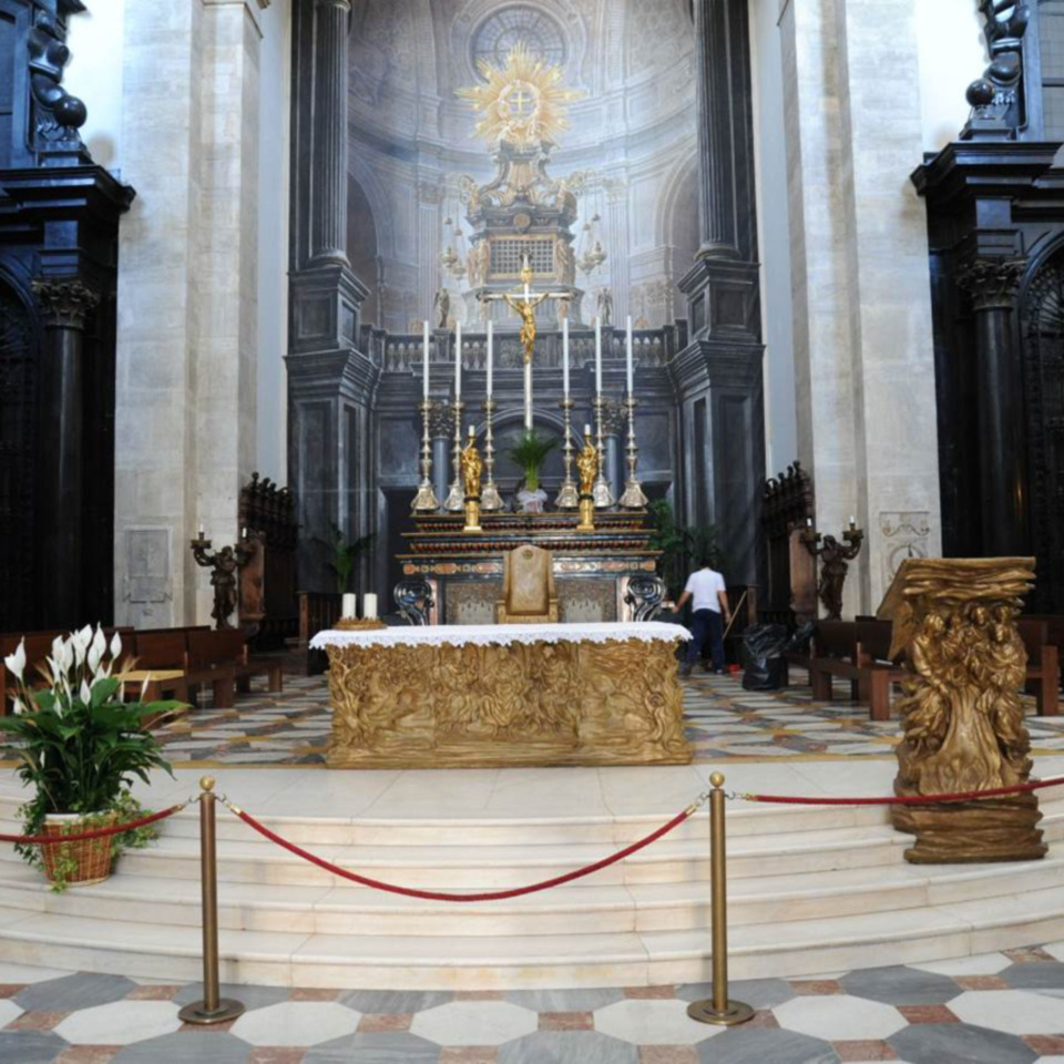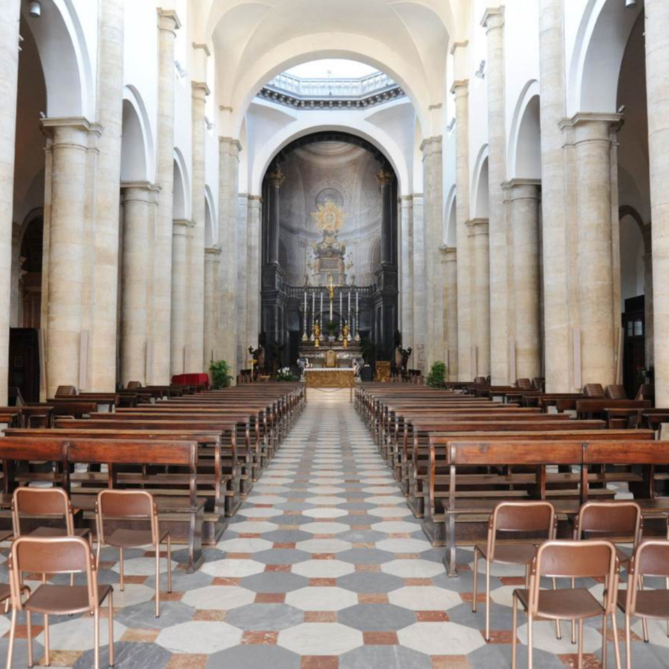 Une grande façade en marbre blanc nous accueille dans cette cathédrale à trois nefs. La nef droite possède six chapelles. La première, celle de la Madonna Grande, remonte à la première moitié du XVe siècle, les deux suivantes (San Gioachino et Sant'Anna) ont été réalisées en 1863 par Tamone. La quatrième est la chapelle de la Nativité, son autel est en simple bois sculpté mais l'effet est agréable. De chaque côté, se trouvent les mausolées en marbre des archevêques de Turin en place entre 1642 et 1689. Avant d'arriver à la cinquième chapelle, on notera la sépulture du cardinal Giuseppe Gamba, archevêque de Turin dans les années 20. La dernière chapelle est dédiée à saint Jean-Baptiste qu'on reconnait sur l'icône peinte par Morgari en 1862. On accède au presbytérium sous la coupole octogonale qui illumine le transept, par quatre marches qui envahissent la nef principale, après l'arc triomphal. Le mobilier est composé des principaux objets liturgiques exécutés en bronze par le sculpteur Mario Rudello et consacrés au culte le 14 novembre 2004 par le cardinal Severino Poletto. Il s'agit d'un autel en marbre de Vérone, de l'ambon et du pupitre épiscopal. La nef gauche présente immédiatement un autel dédié à San Luca, datant de la moitié du XIXe, il est décoré en style néoclassique. Suit la chapelle de la Résurrection décorée en marbre blanc en 1727, on peut y voir la peinture sur bois réalisée par Giacomo Rossignolo en 1575. La toile de la troisième chapelle dédiée aux saints Hyppolite et Cassian est du peintre Caravoglia. La quatrième chapelle financée par la corporation des forgerons et des orfèvres contient une toile représentant Sant'Egidio Vescovo. La chapelle suivante (San Massimo et San Antonio) est enrichie d'une icône peinte vers la moitié du XVIIe siècle par Casella de Lugano lequel a également réalisé les deux fresques latérales représentant San Giovanni Evangelista et San Giovenale. La dernière chapelle de cette nef contient le Baptistère réalisé en style néoclassique en 1852 et protégé par une grille en fer datant de 1630.