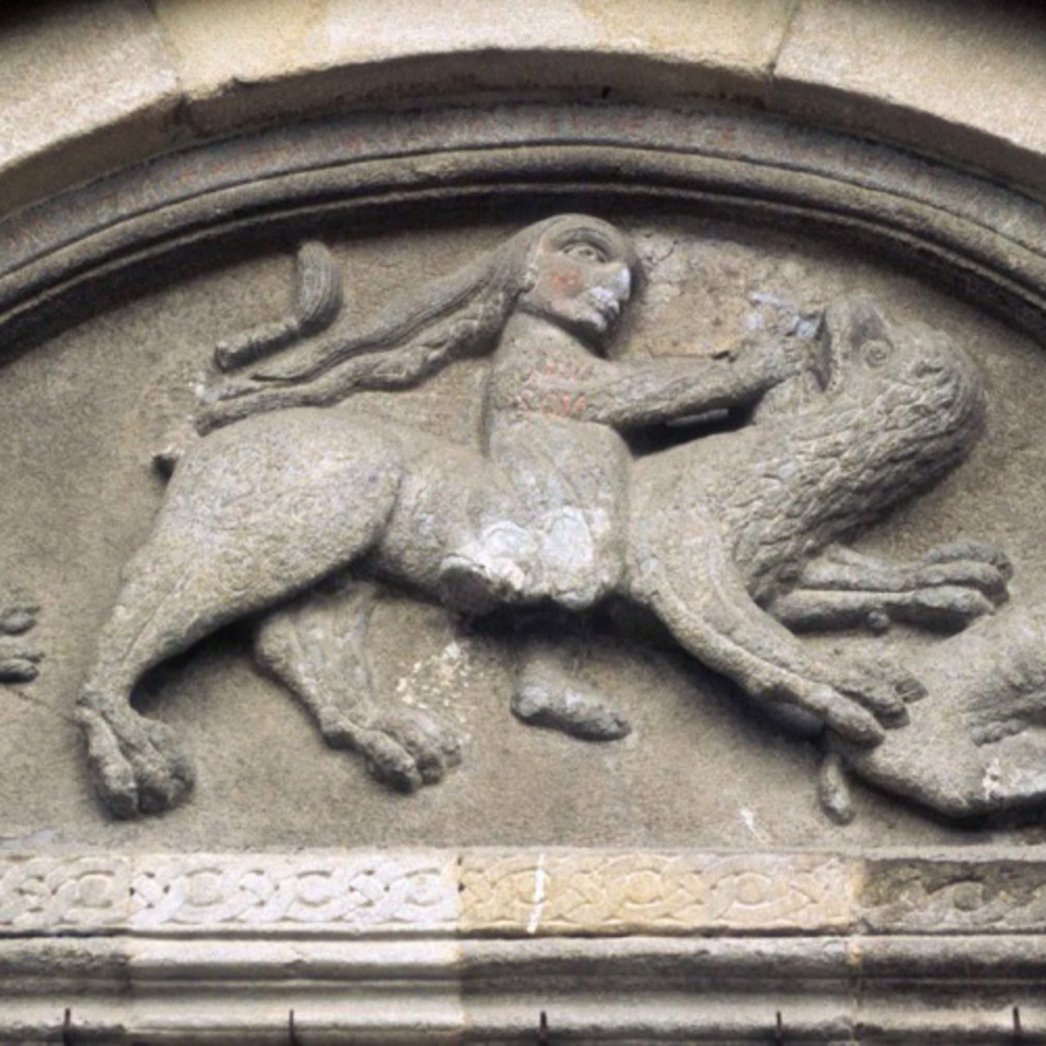 La facciata, mai completata, conserva il portale originario, datato 1183 e firmato da magister Albertus. Nella lunetta sono scolpite le scene di “ Sansone che smascella il leone” e di "Davide che salva il gregge assalito dal leone”. I capitelli di sinistra riproducono una serie di grifoni, mentre quelli di destra rappresentano scene di vita nelle diverse stagioni dell’anno.